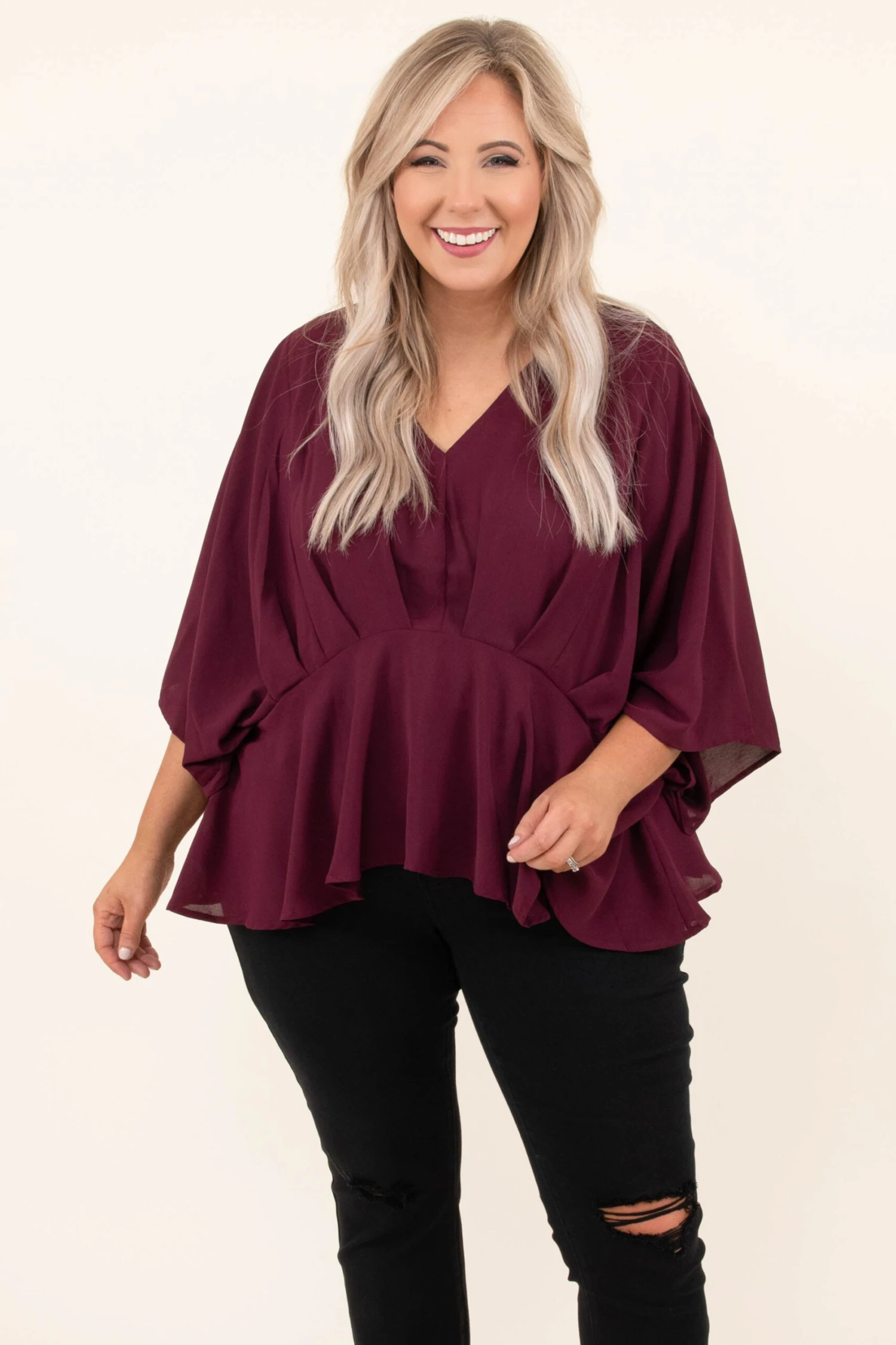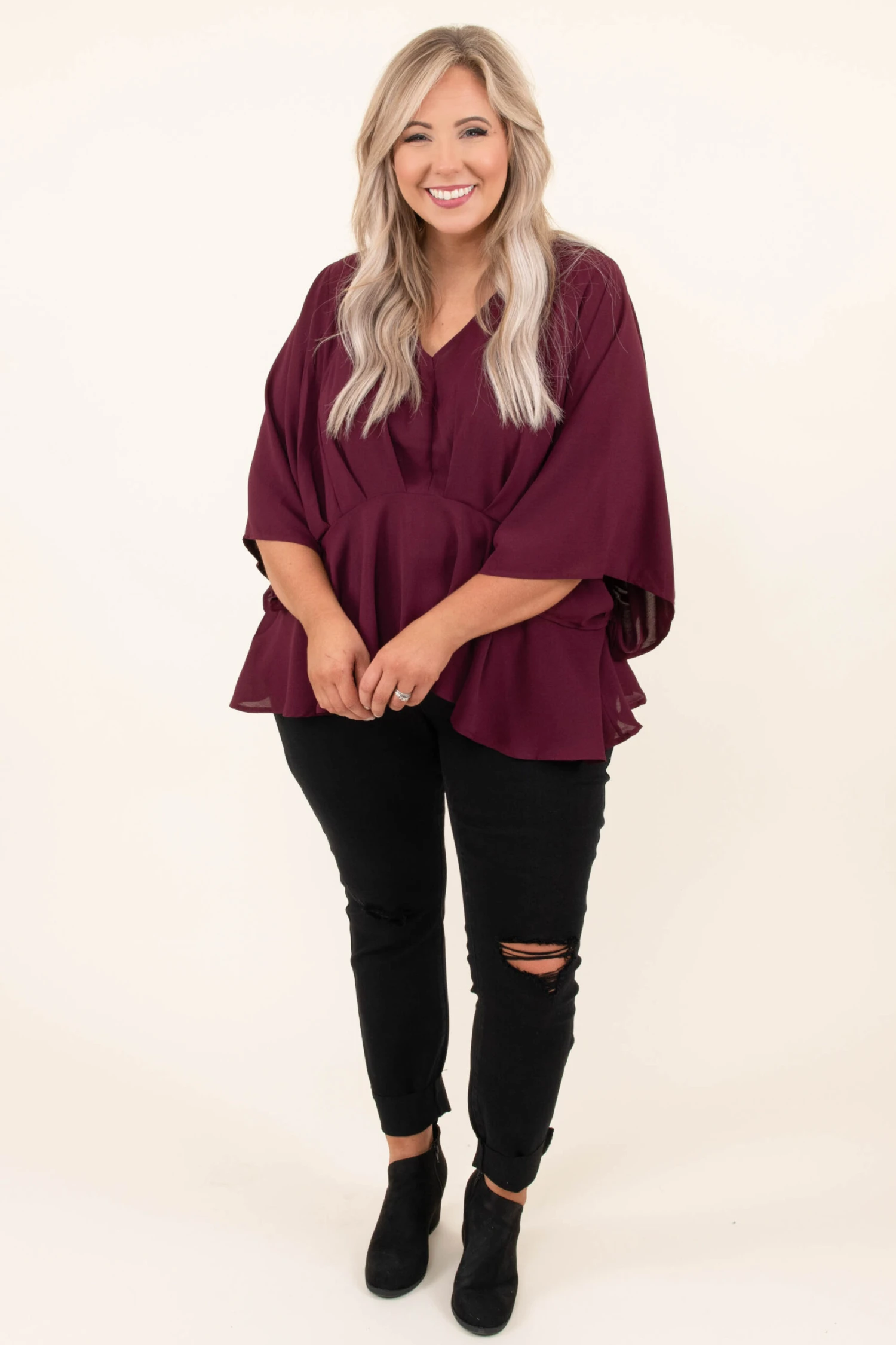 You are gonna look so cool and chic in this top! This top has a solid neutral color you can dress up or down for every occasion! It’s comfortable for all day wear, has a flowy yet figure flattering fit, and features the cutest batwing sleeves! Style this top with skinnies and booties for an easy everyday outfit!