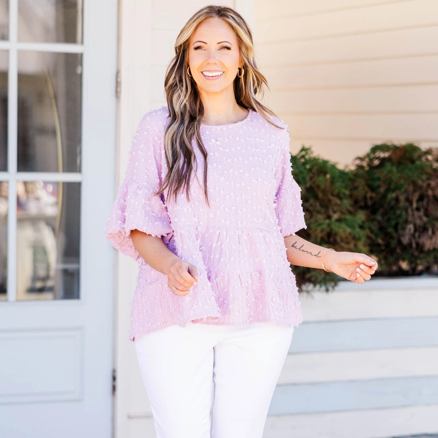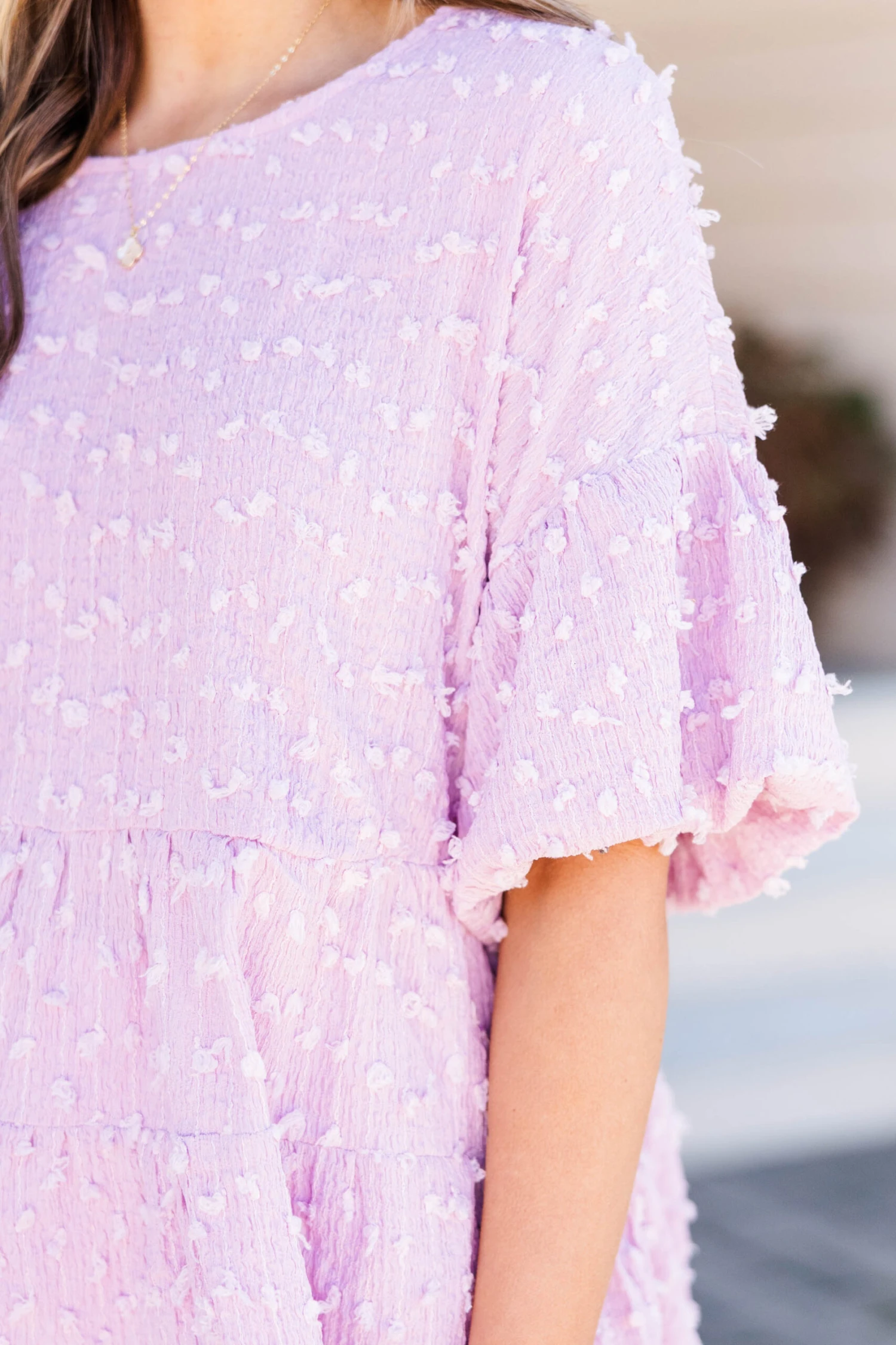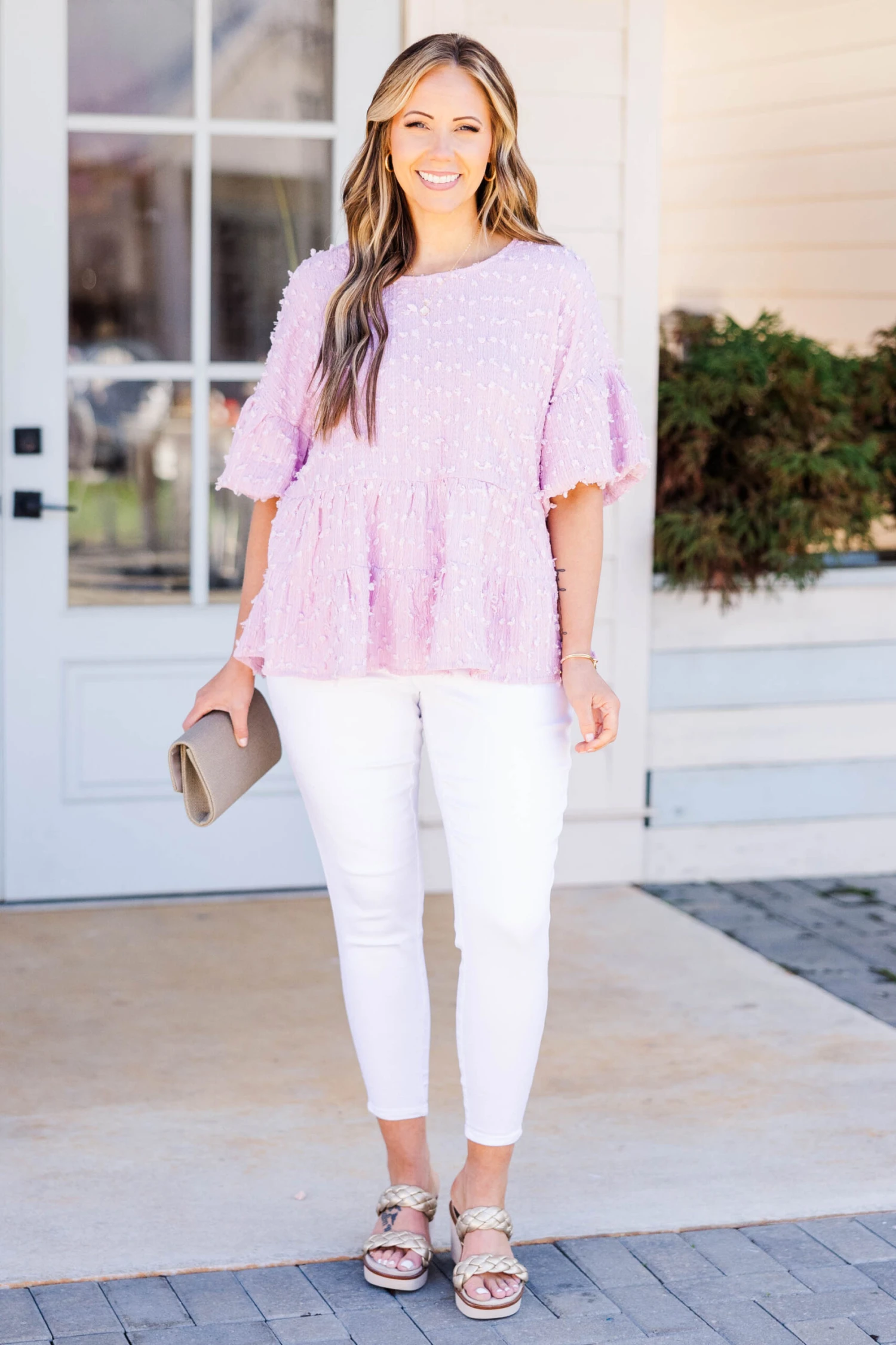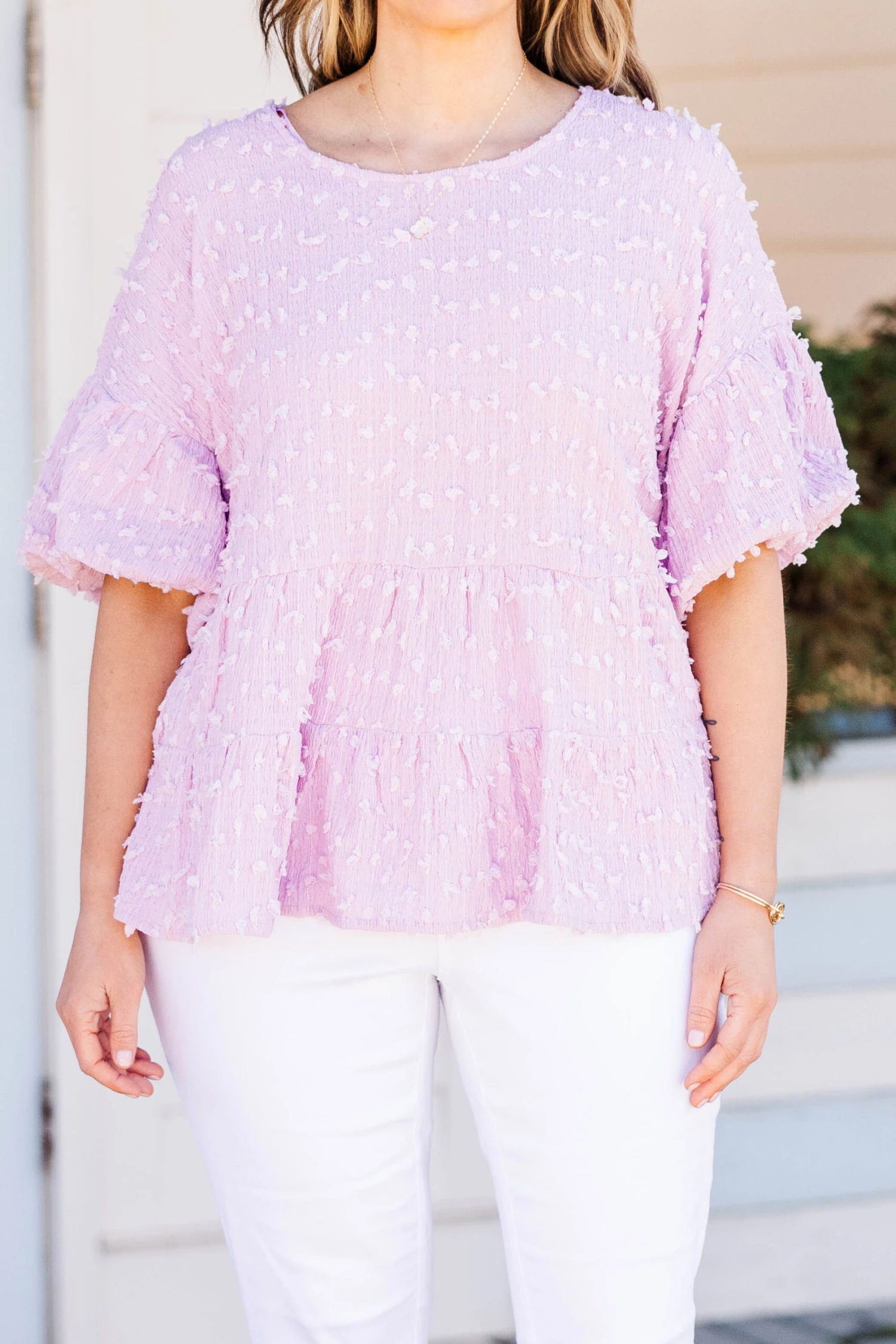 Elevate your style with this lovely top in a beautiful blush color! The raised polka dot pattern adds a touch of elegance, perfect for a brunch date or a day out on the town! Upgrade your wardrobe and exude confidence with this versatile piece!
