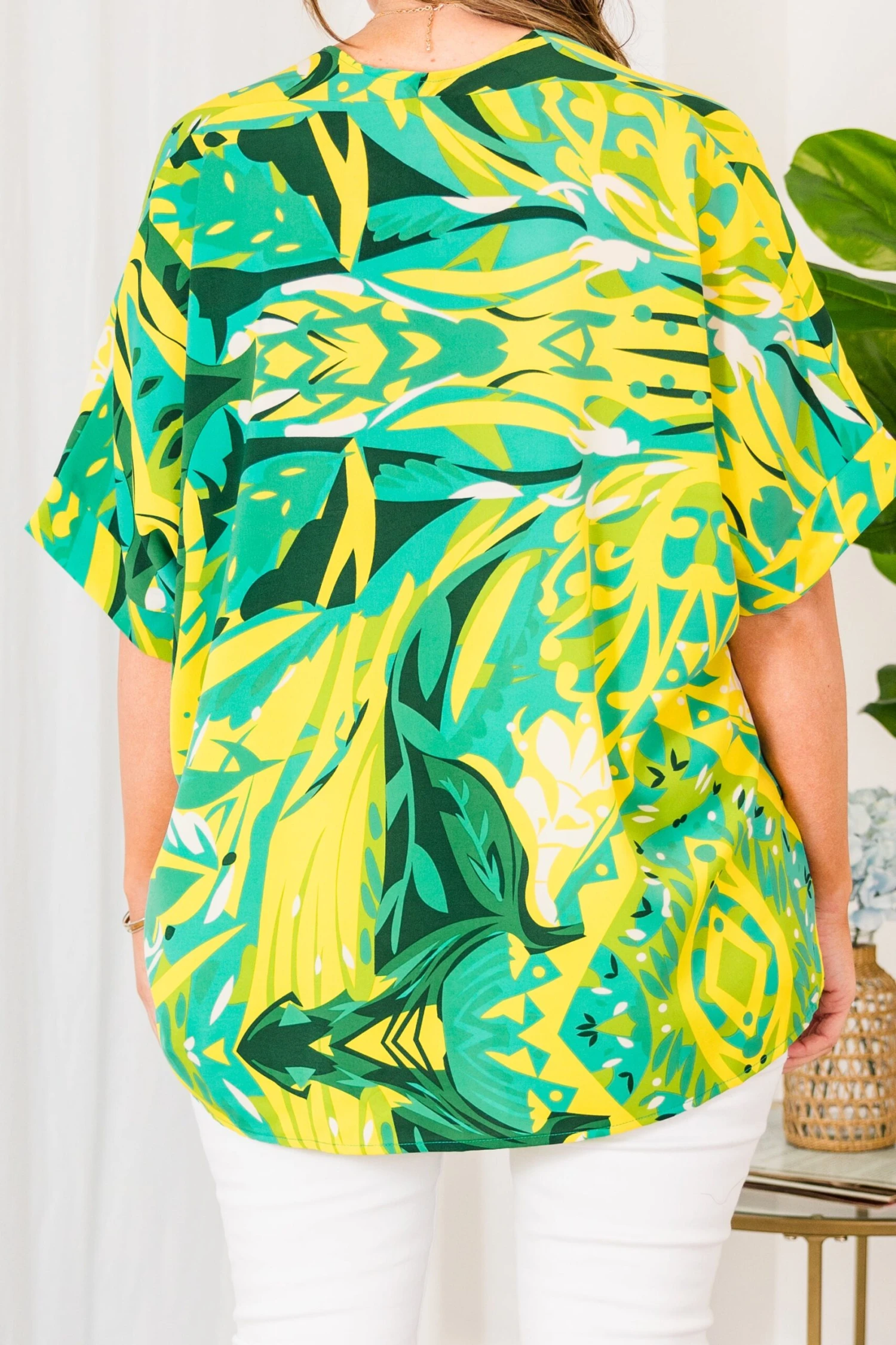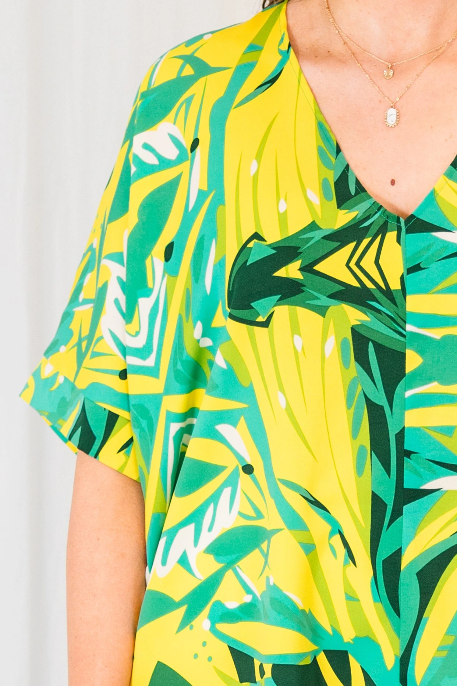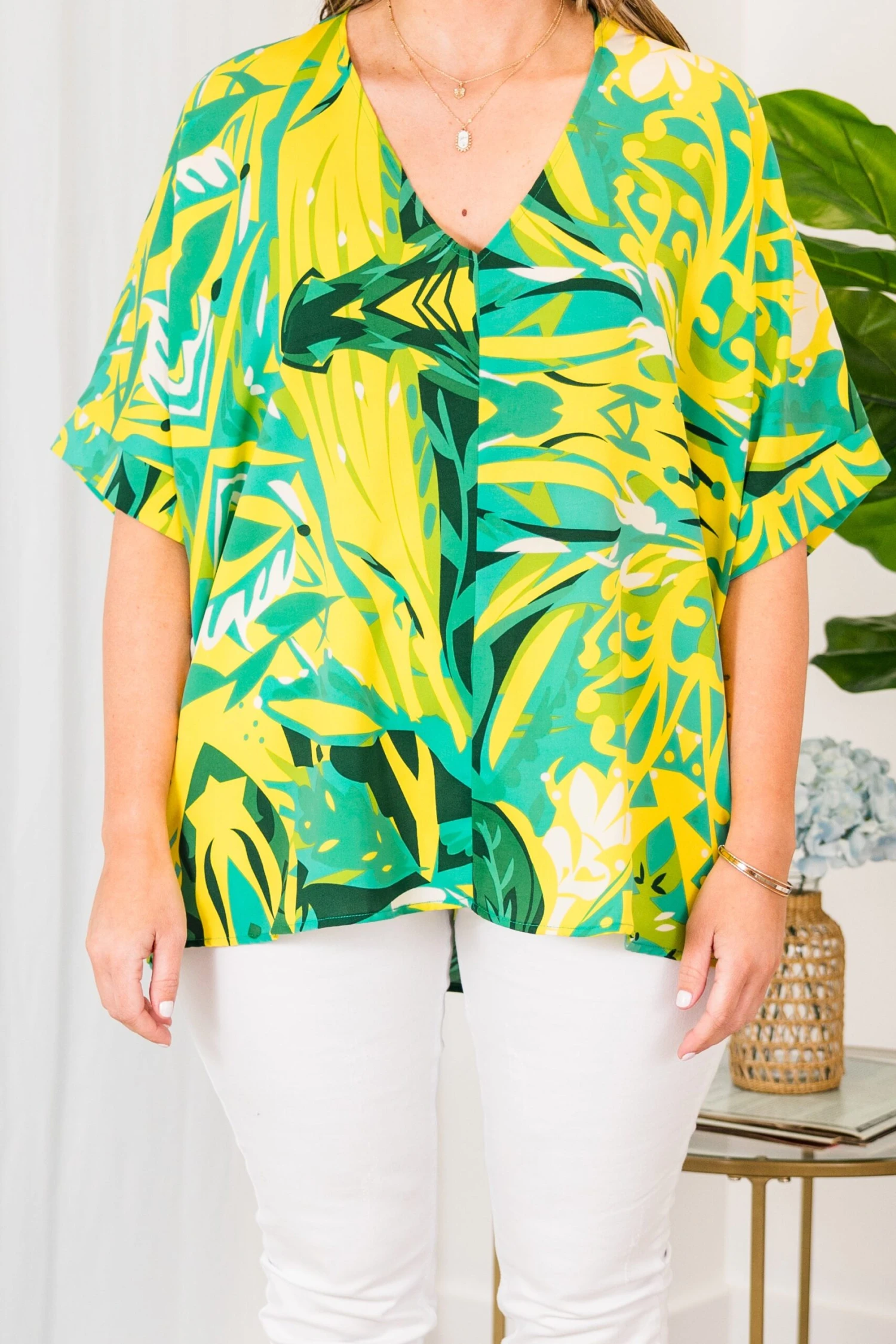 Take a trip to paradise with the Alas, Paradise Top in green! Featuring an abstract tropical pattern, this top is perfect for your next resort adventure! Don’t miss out on this must-have piece for your wardrobe!