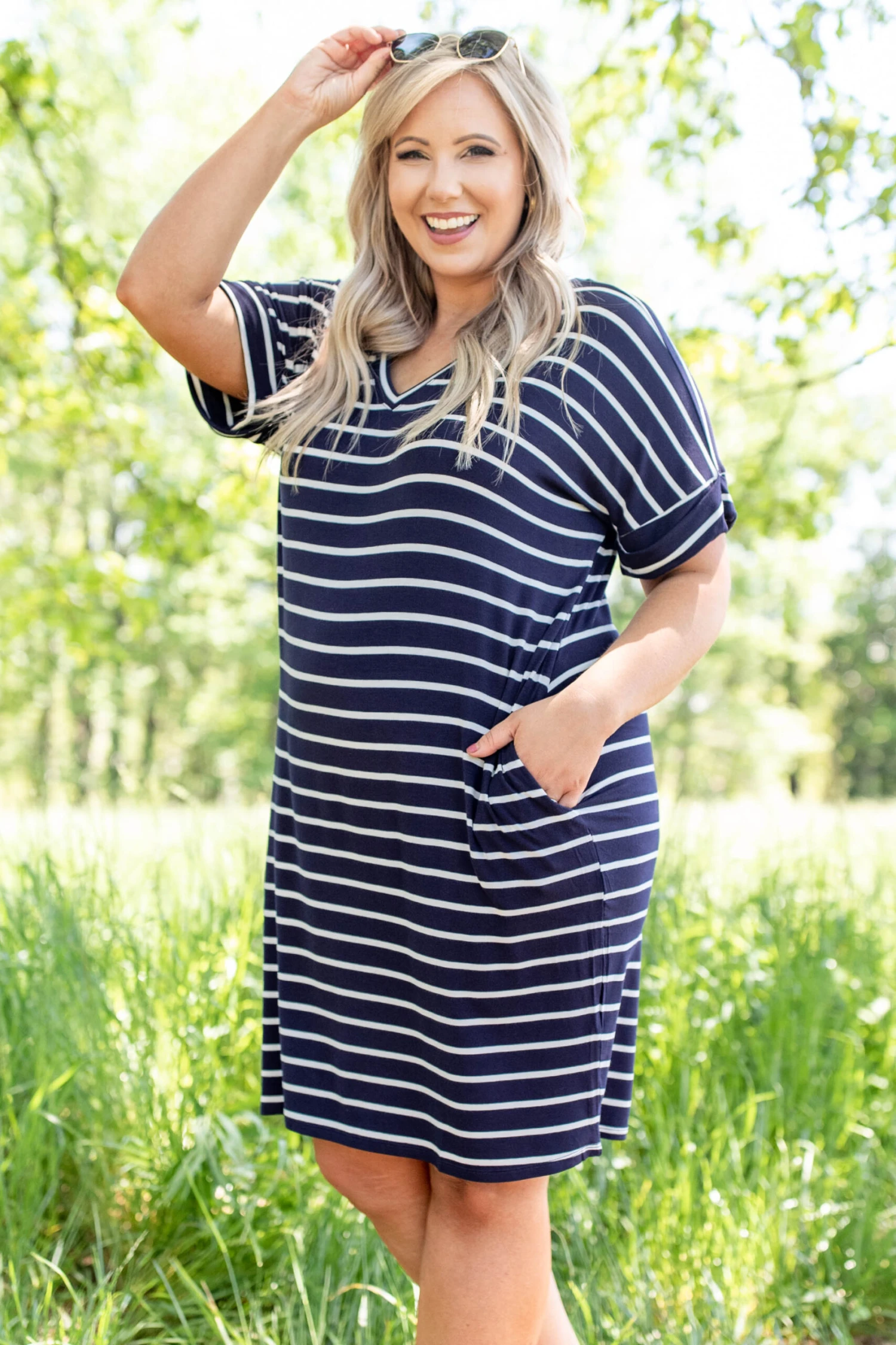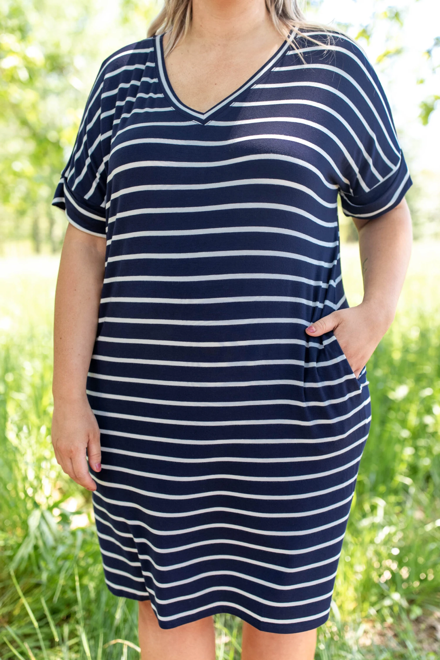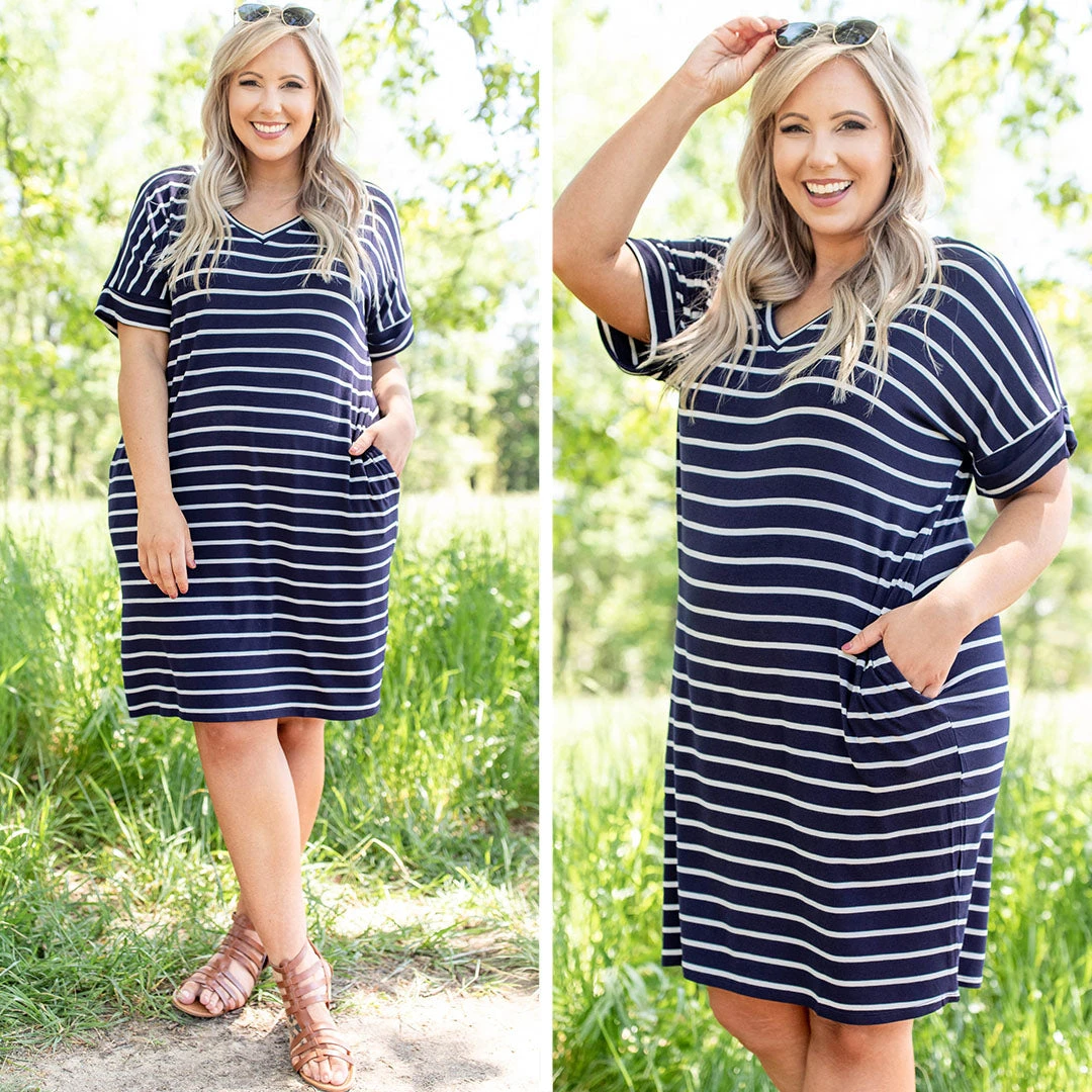 This is the dress you can wear all times of the year! This dress has a pretty striped pattern with colors you can dress up or down for every occasion! It’s comfortable for all-day wear, has a figure-flattering fit! Simply style this dress with flats or booties for your next event!
