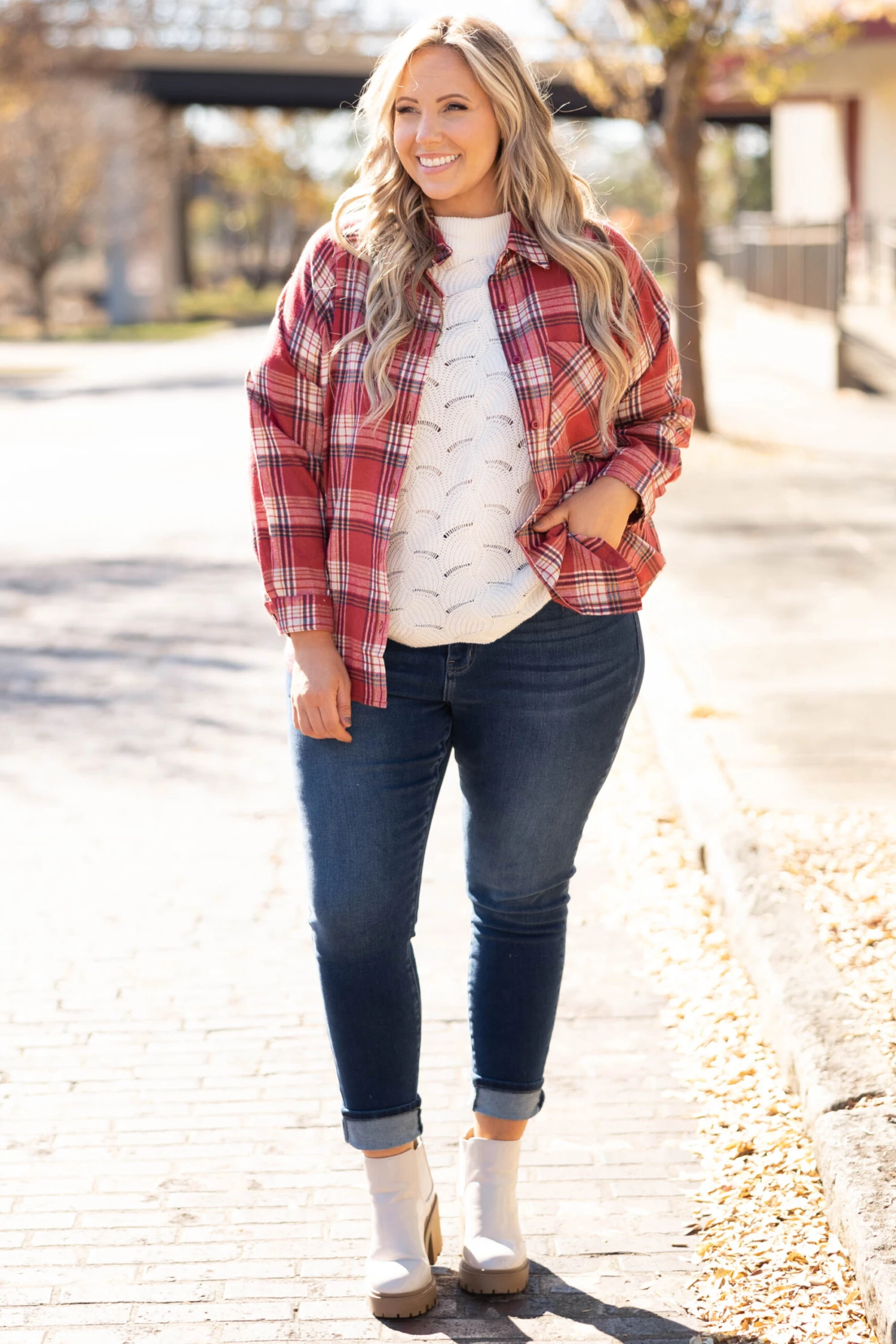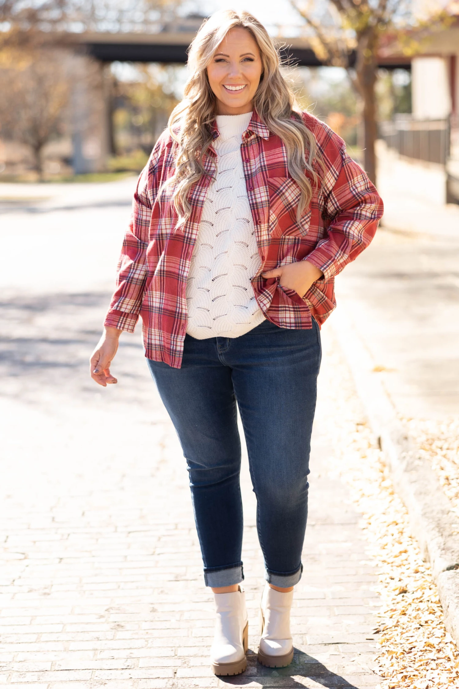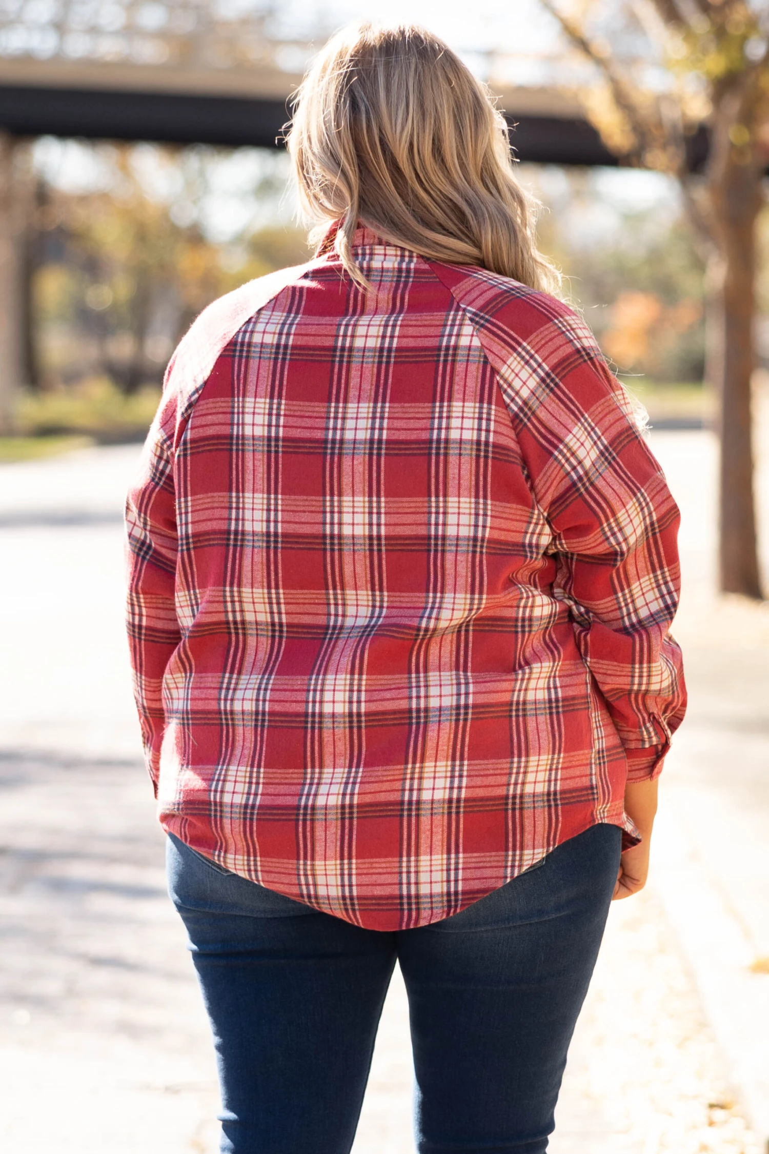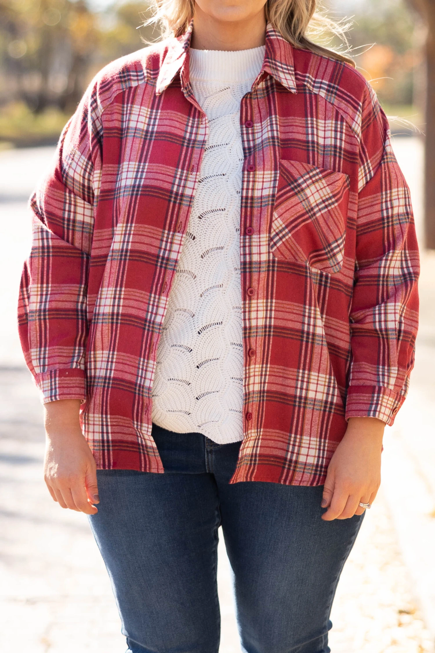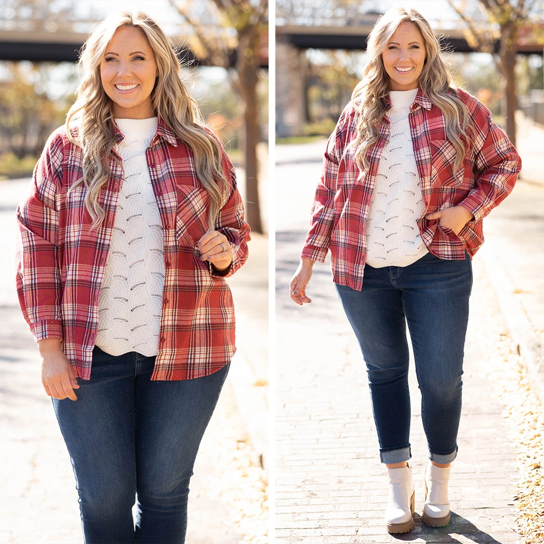 We saved this top just for you! It has a bold red color with a trendy plaid pattern that is just in time for the season! The functional buttons and flattering fit are perfect for all day wear! Style this top with some skinnies and boots for a casual chic look!
