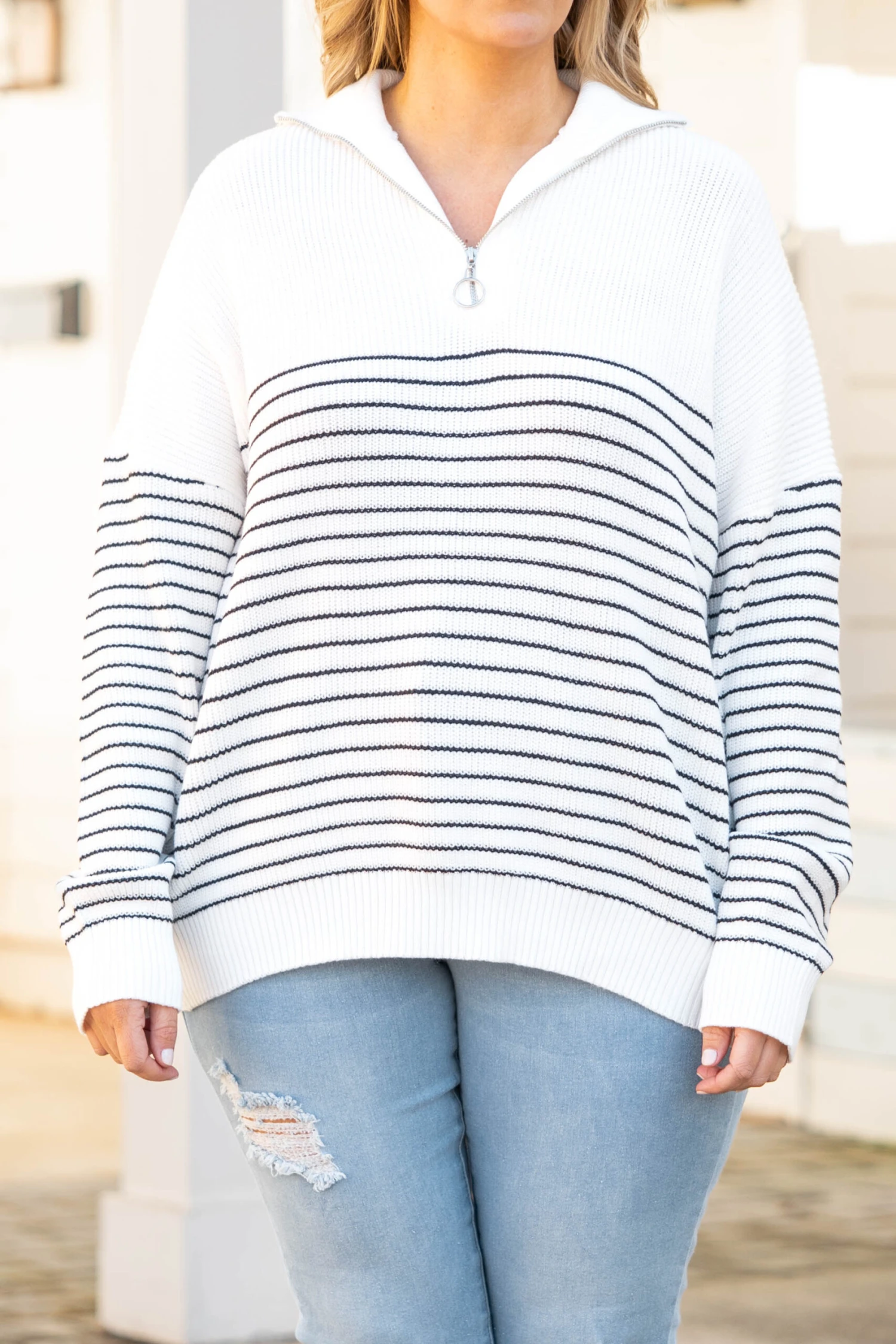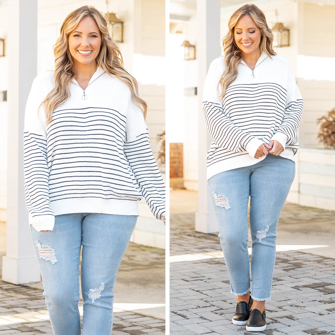 Elevate your wardrobe with the addition of this beauty! It has a classic white color with a trendy stripe pattern that is a season fave! The stretchy, flattering fit is great for layering over a solid top and shorts or skinnies for a casual chic look!