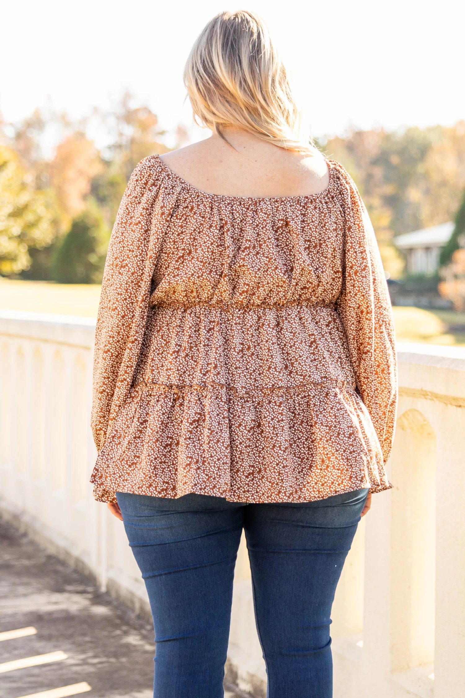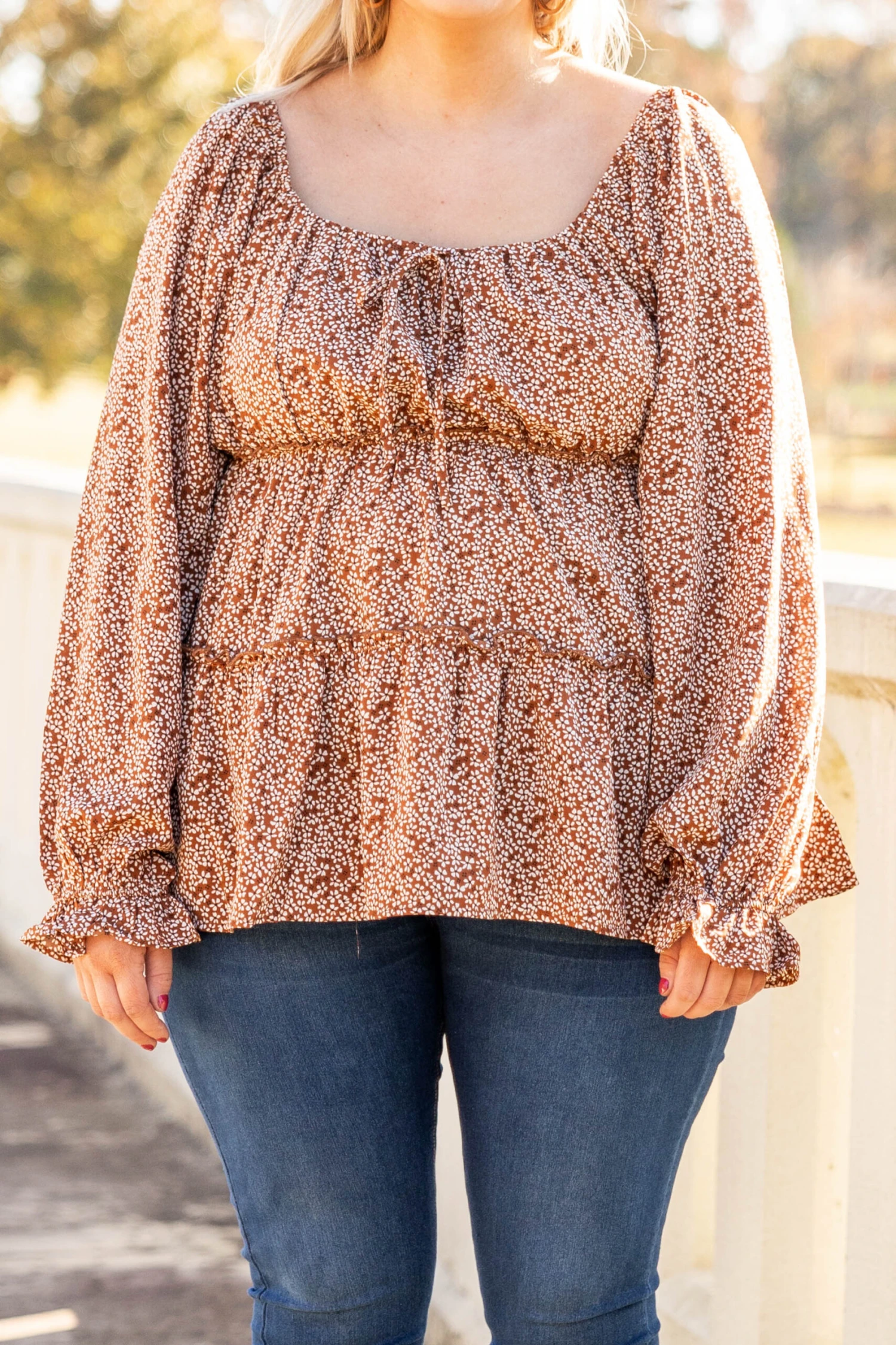 We found the perfect top at last! It has a sweet brown color with a funky floral print that you are sure to love! It also features a cute tie at the top plus a flattering babydoll fit. Style this cutie with jeans and booties for fun, cute look!