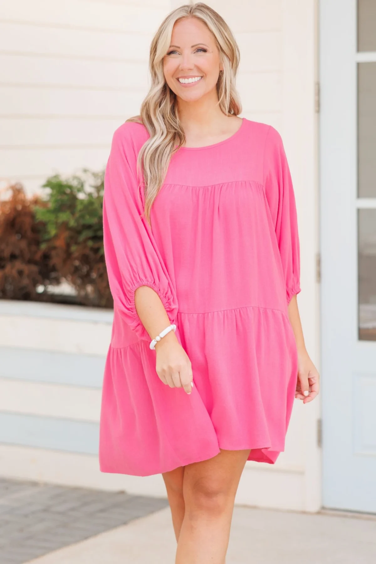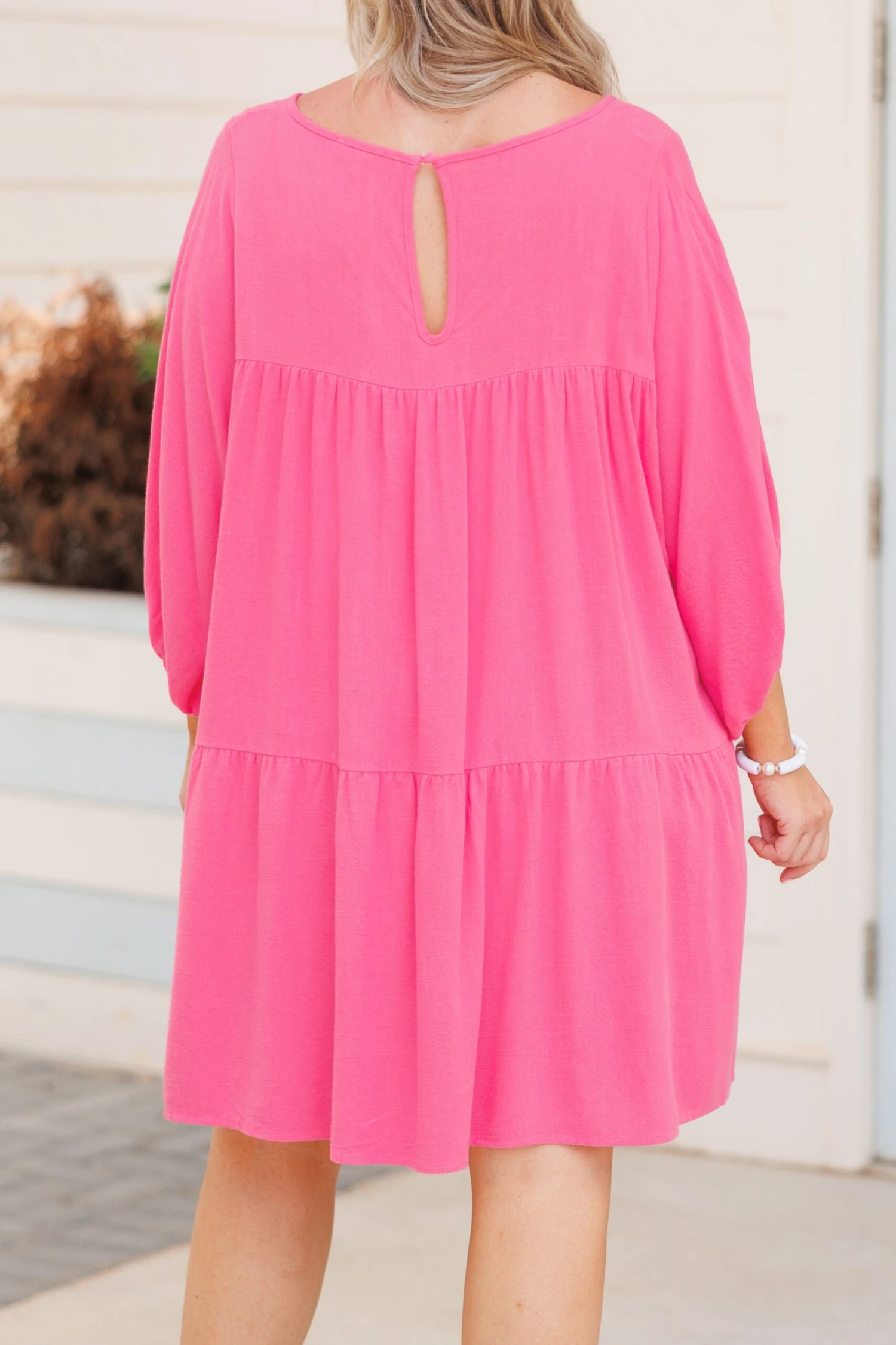 This dress will definitely have you in style! The bold pink color is so perfect to match with whatever you want and the tiered style is so flattering! This cutie is perfect to throw on with some heels or wedges for a chic look!