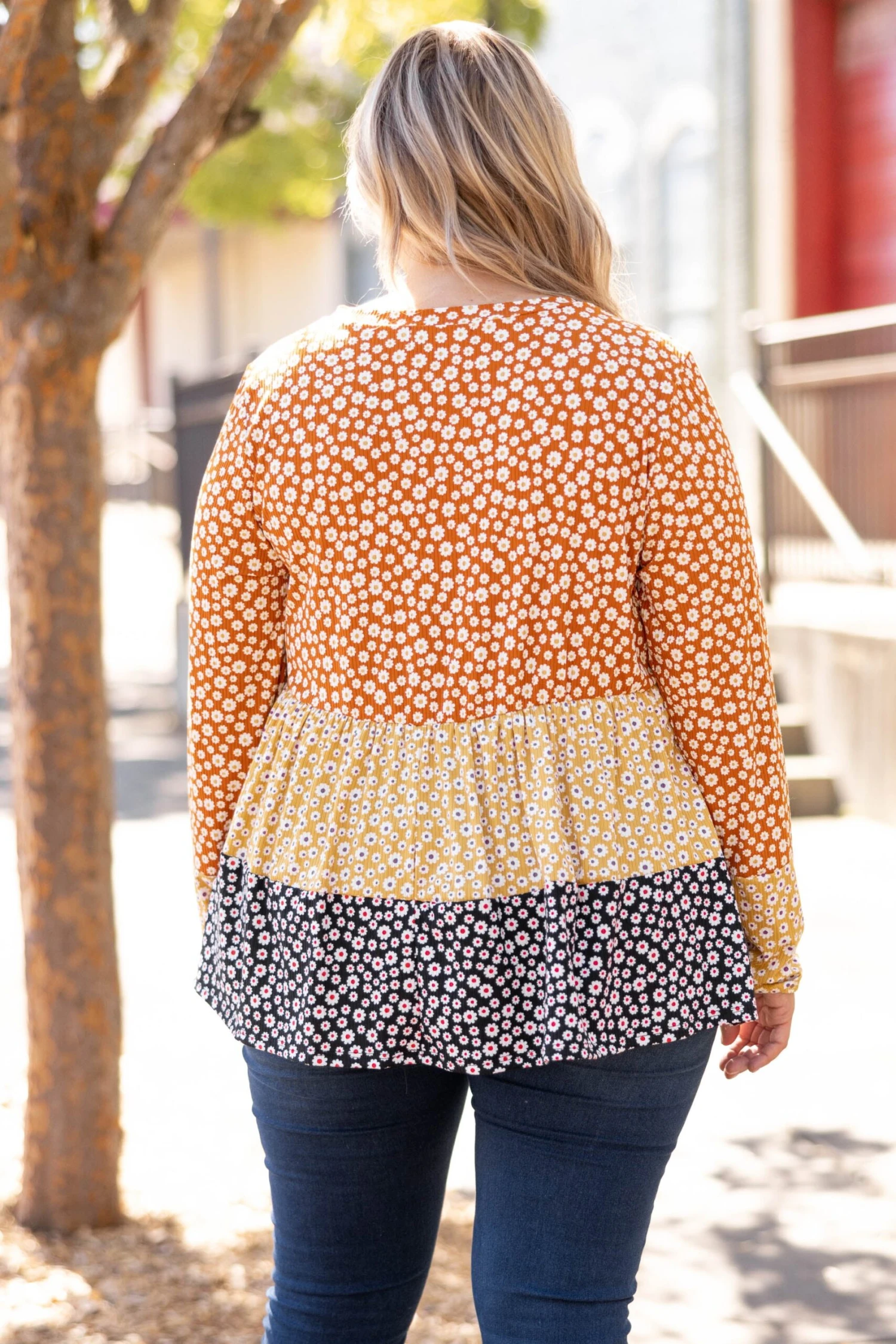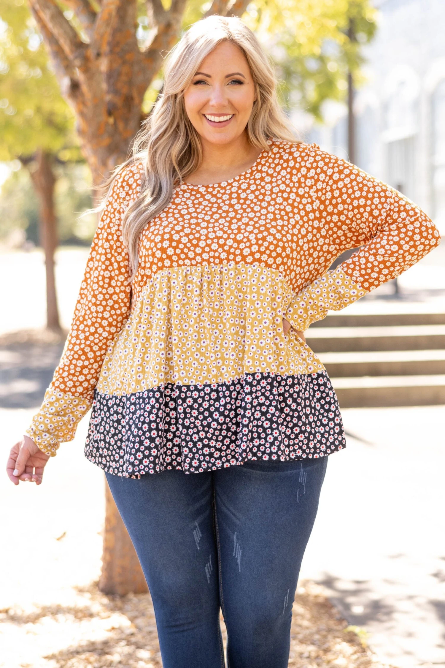 Our love for this top just keeps blooming! This top has a beautiful rust color with a colorblock design that is super chic! The floral pattern and ribbed texture is perfect for pairing with all of your favorite bottoms! Style this top with some skinnies and booties for a cute, casual look!