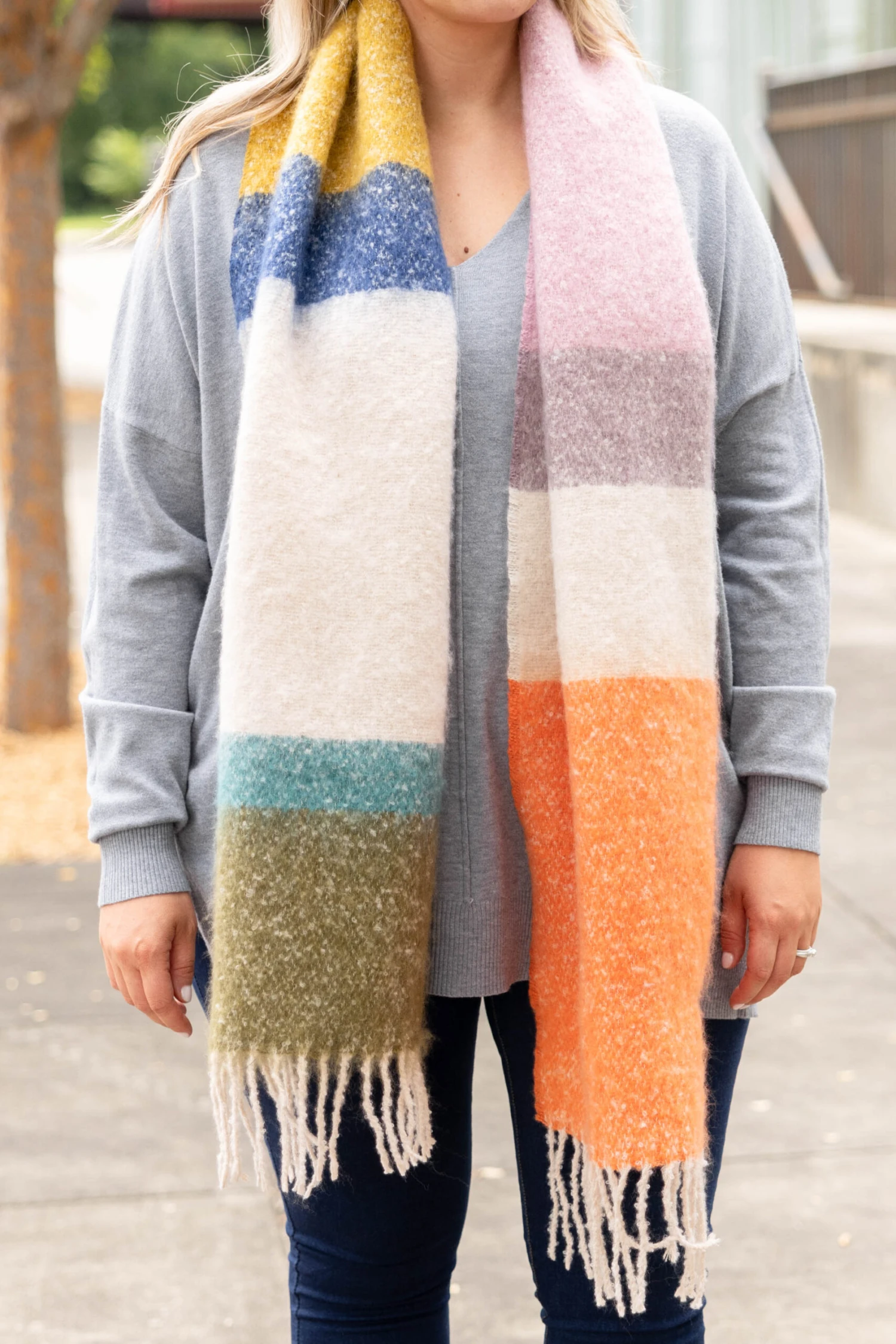 We simply love this beautiful scarf! This scarf has a gorgeous multi color design and trendy tassels along the bottom! Style this scarf with a solid top and skinnies for a chic, cozy look this season!
