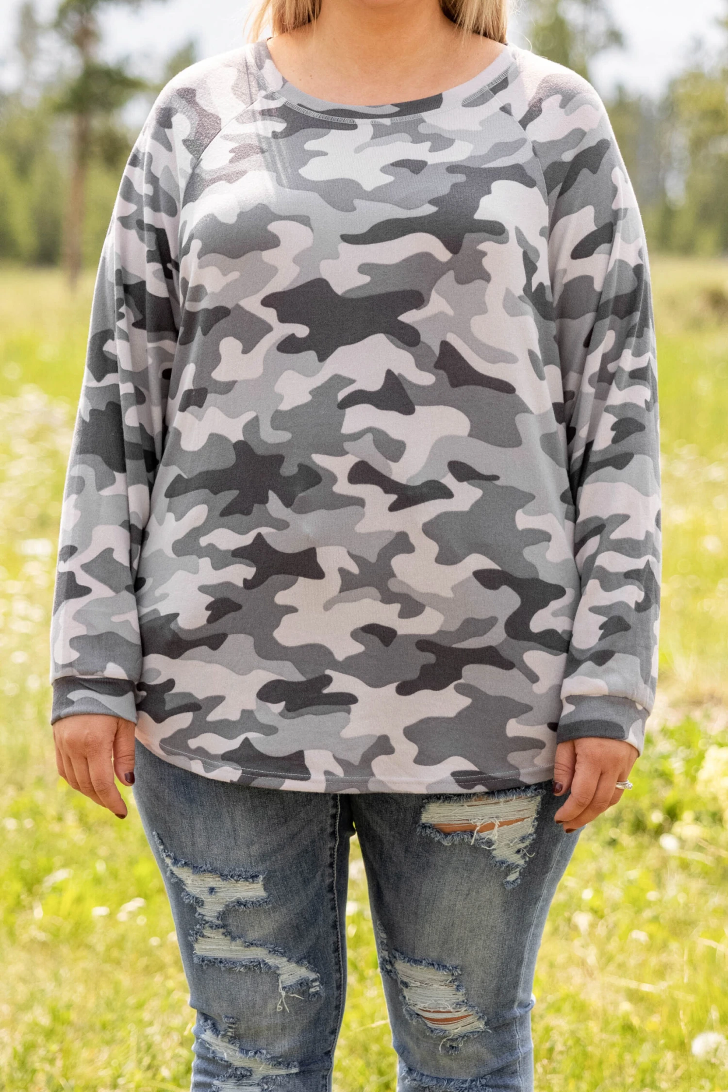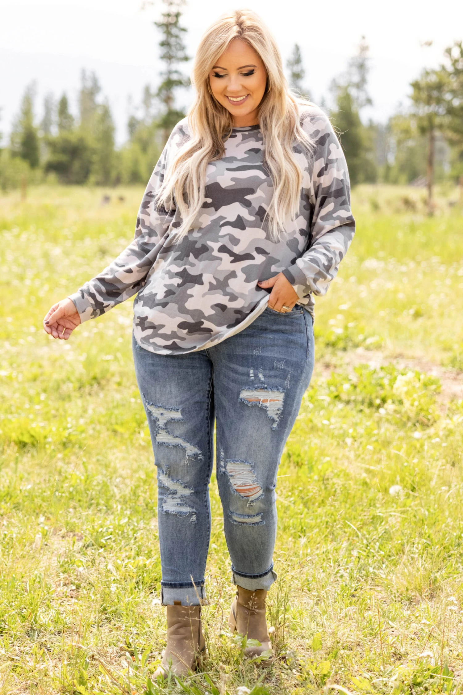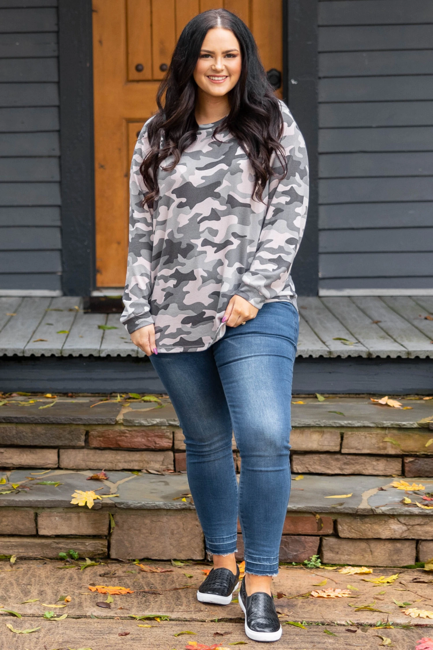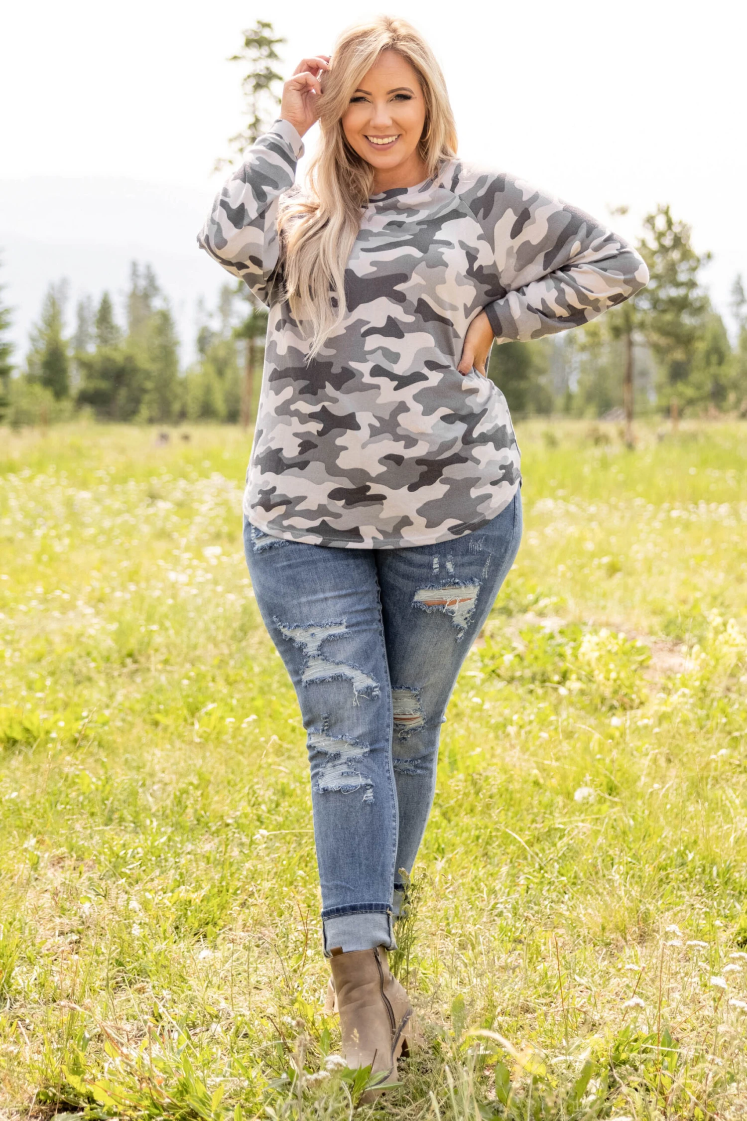 Curved Hem Slouchy Dolman Tunic, Camo Gray