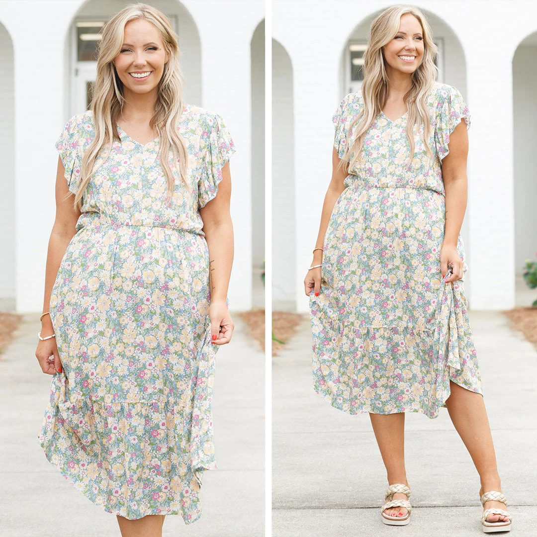 Get dolled up and out on the town in this beauty! Featuring flutter sleeves and a trendy floral pattern, this denim dress is the perfect midi length! With effortless styling, it’s great for a brunch date with that special someone!