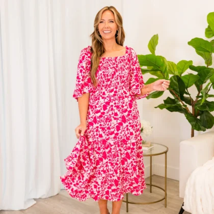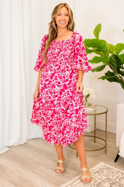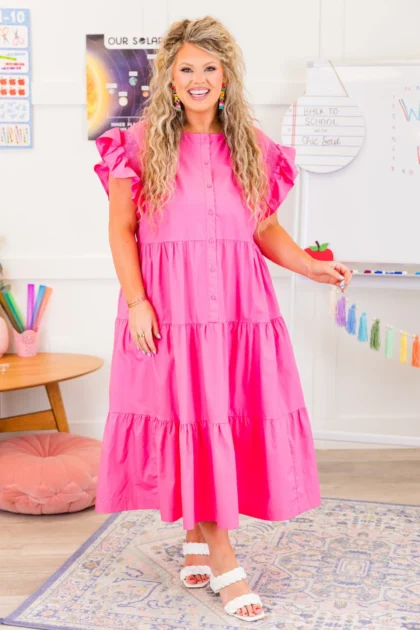 Blushing Button Midi Dress, Hot Pink
