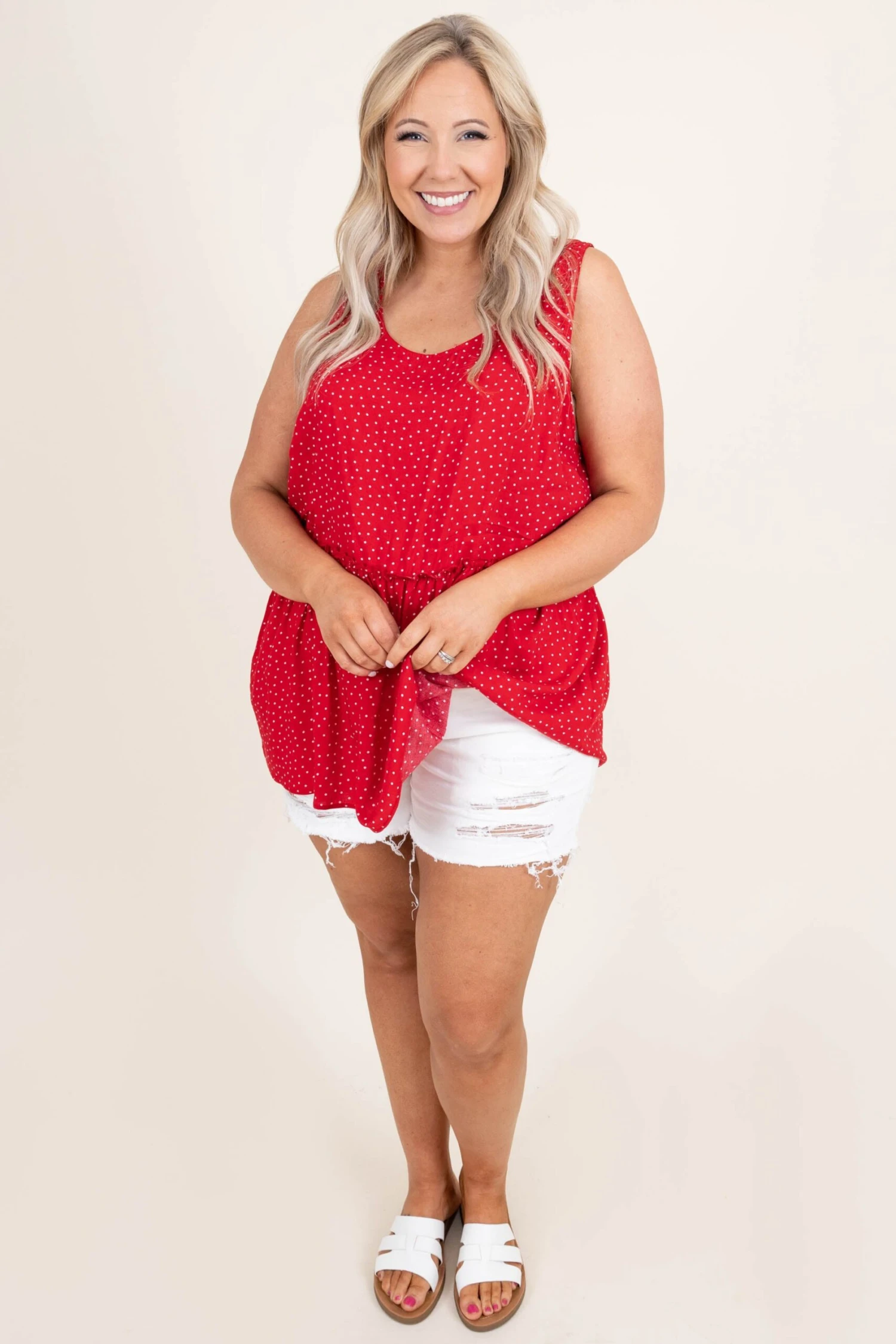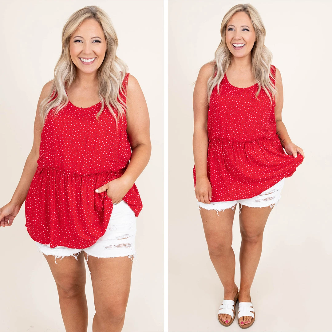 This top gives us that friday eve feel! The red color will have all eyes on you and the sweet white polka dot pattern has us obsessing! This cutie has a babydoll style to flatter all and a fun ruffle on the waist for a sweet touch! Style it with some white shorts for the perfect look!