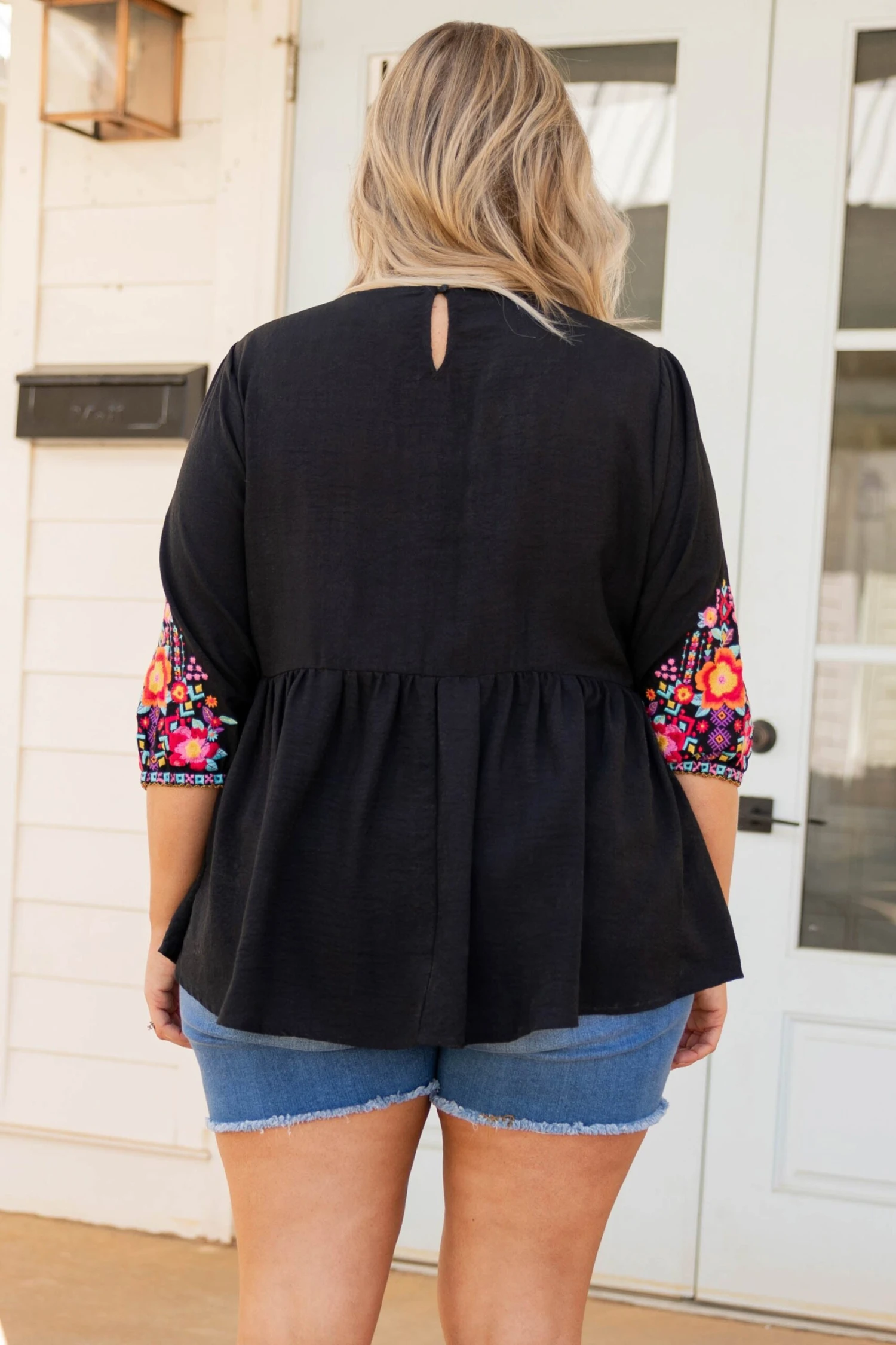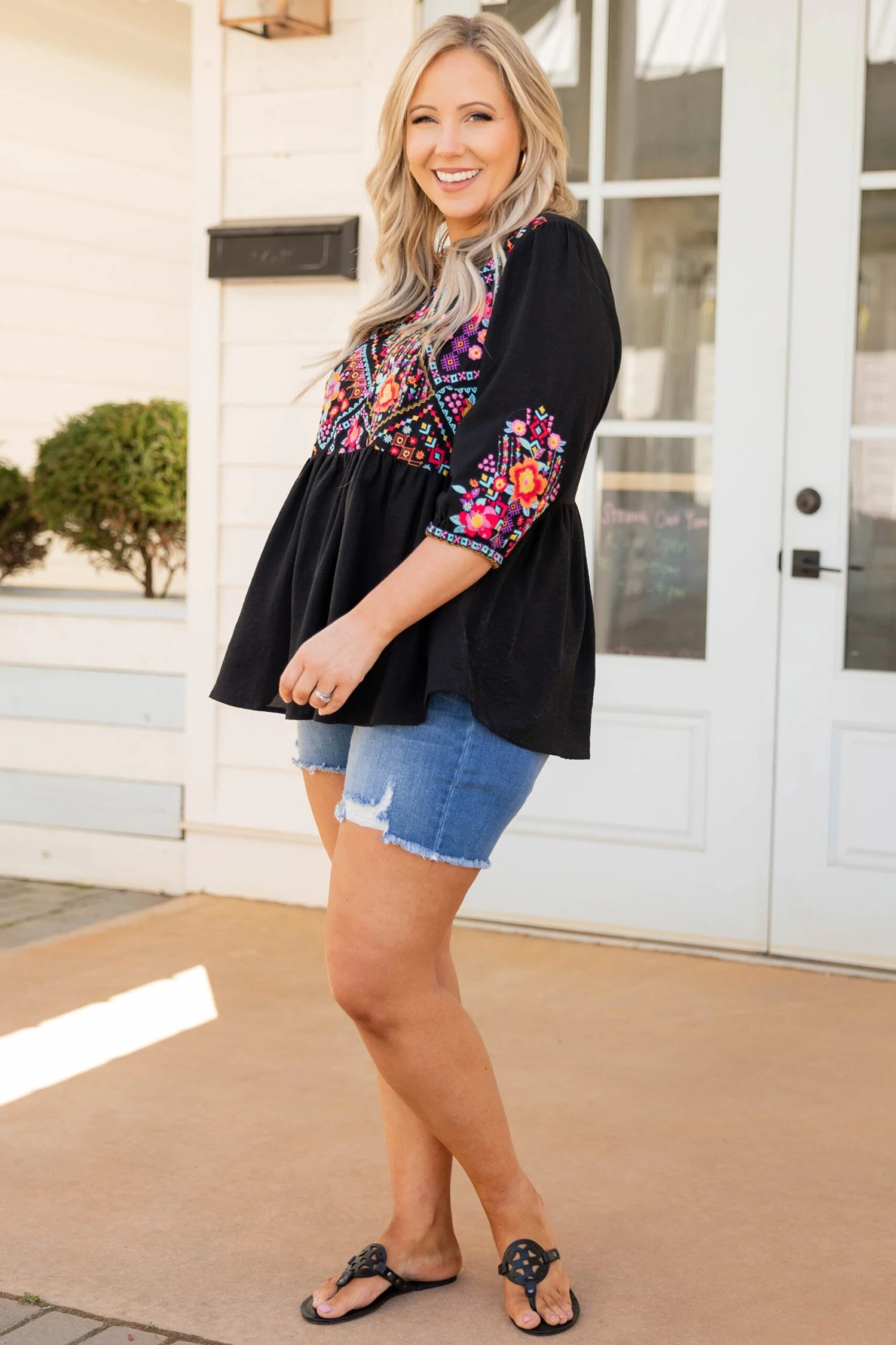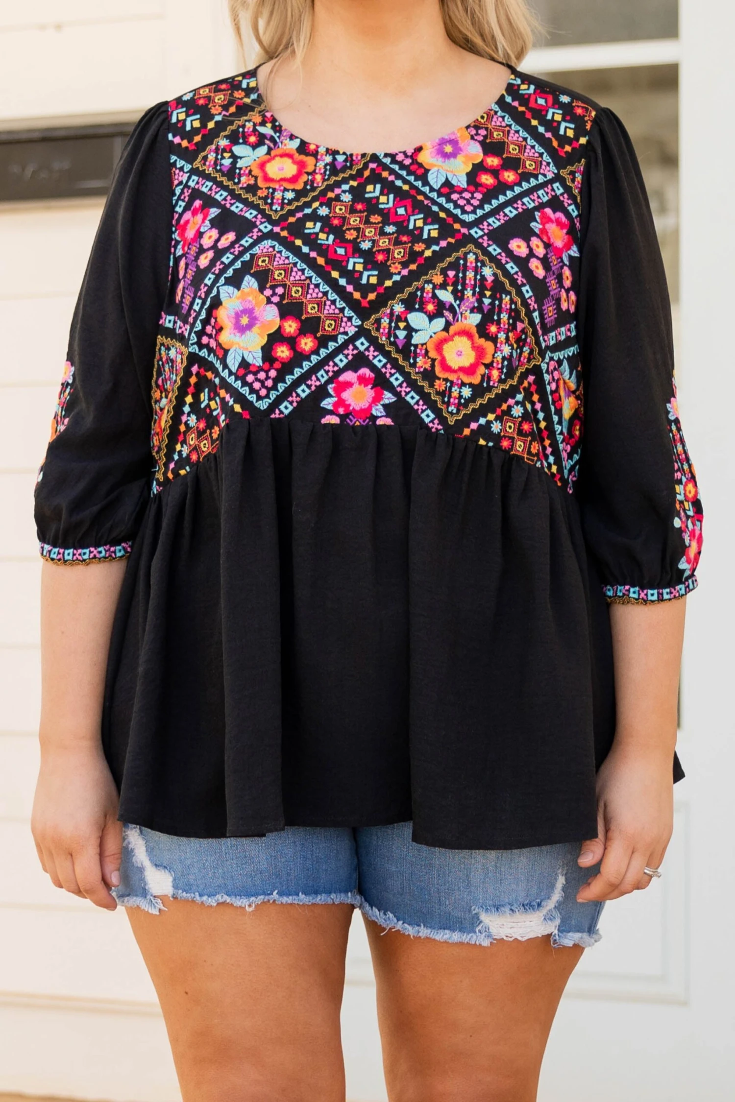 You heard it here first ladies! This is the perfect top for every season! It has a pretty embroidered pattern with a black color that’s perfect for the season! It’s comfortable for all-day wear has a flowy fit, and features the cutest print on the sleeves! Style this top with skinnies and wedges for an effortlessly chic look!