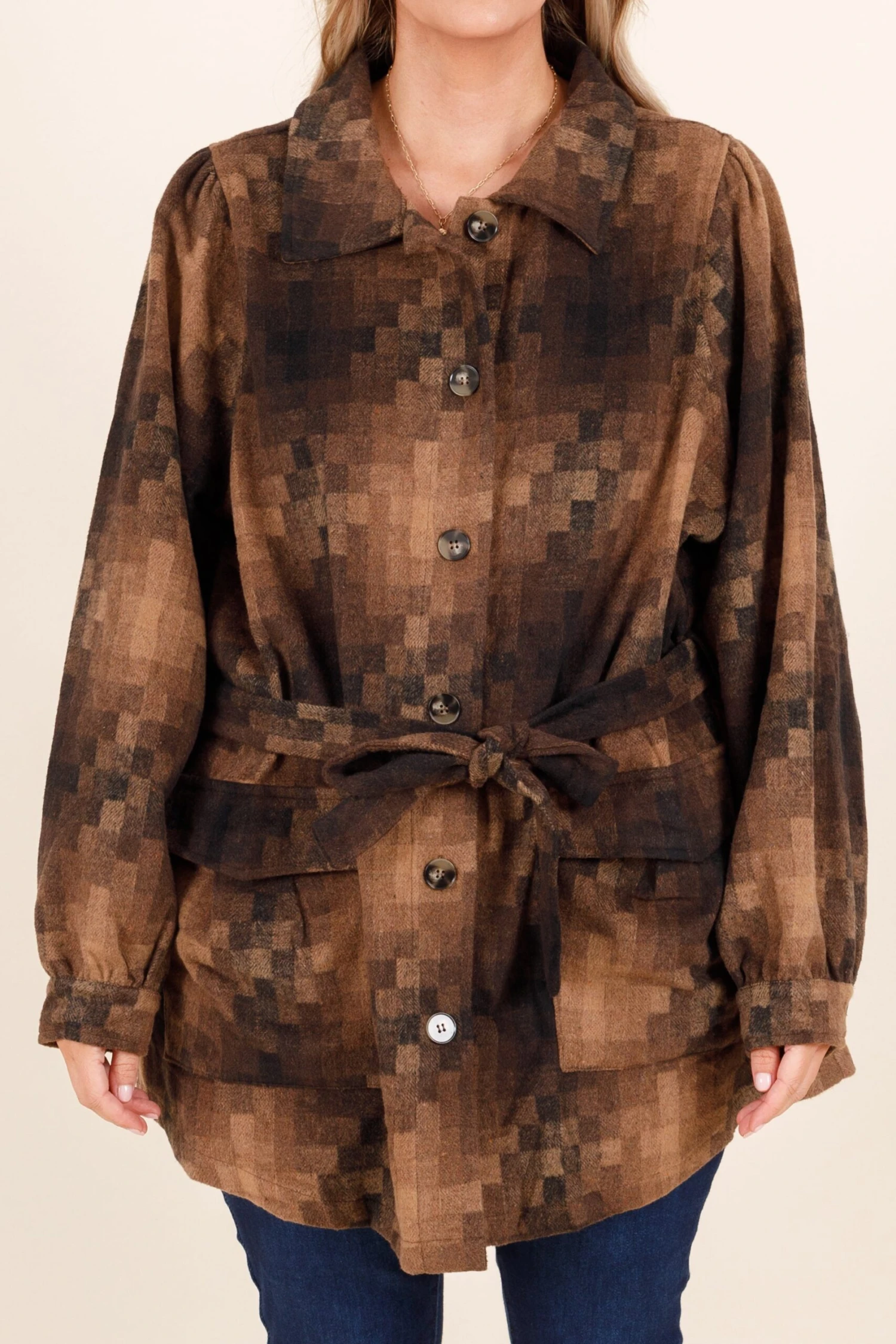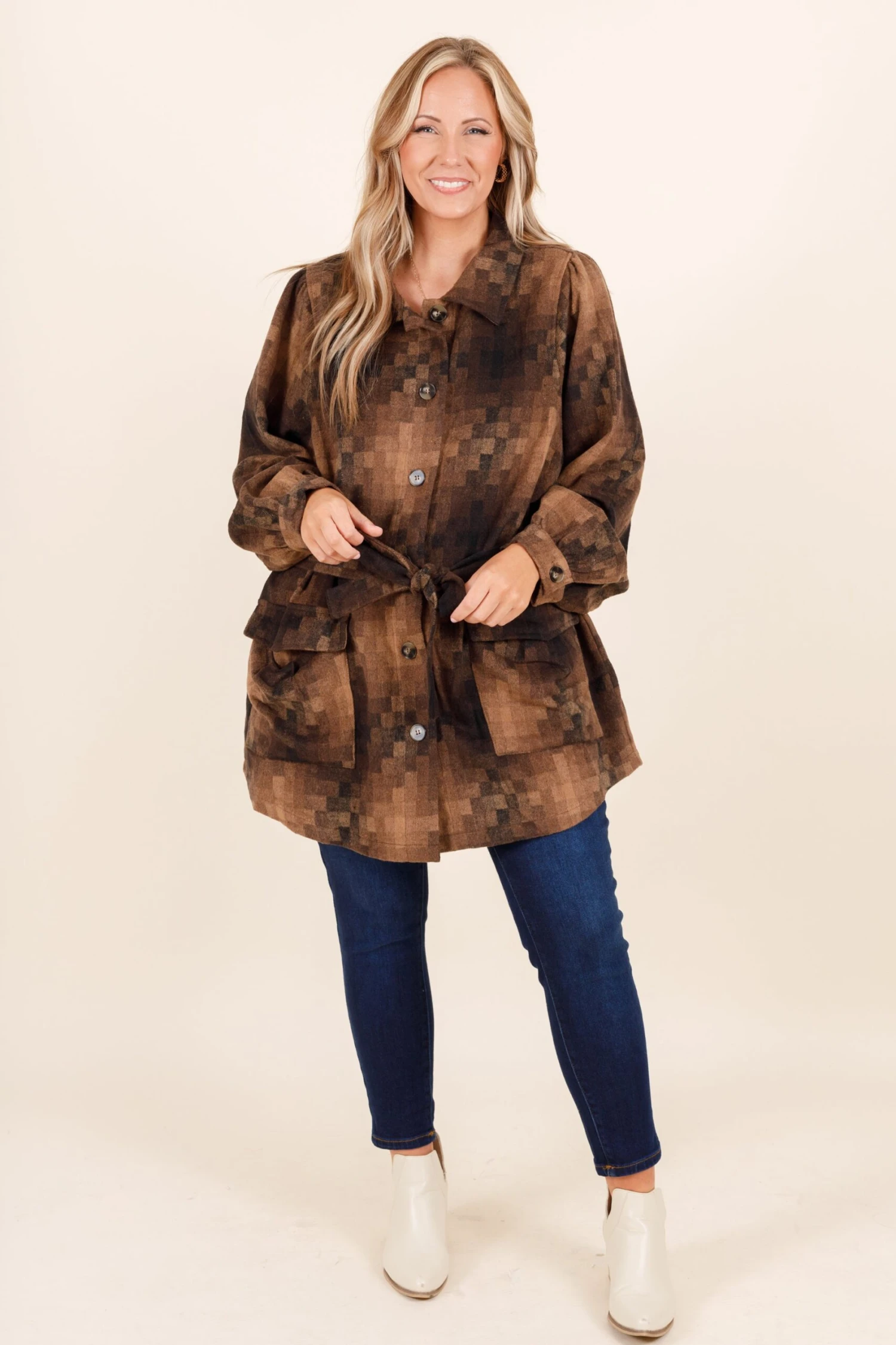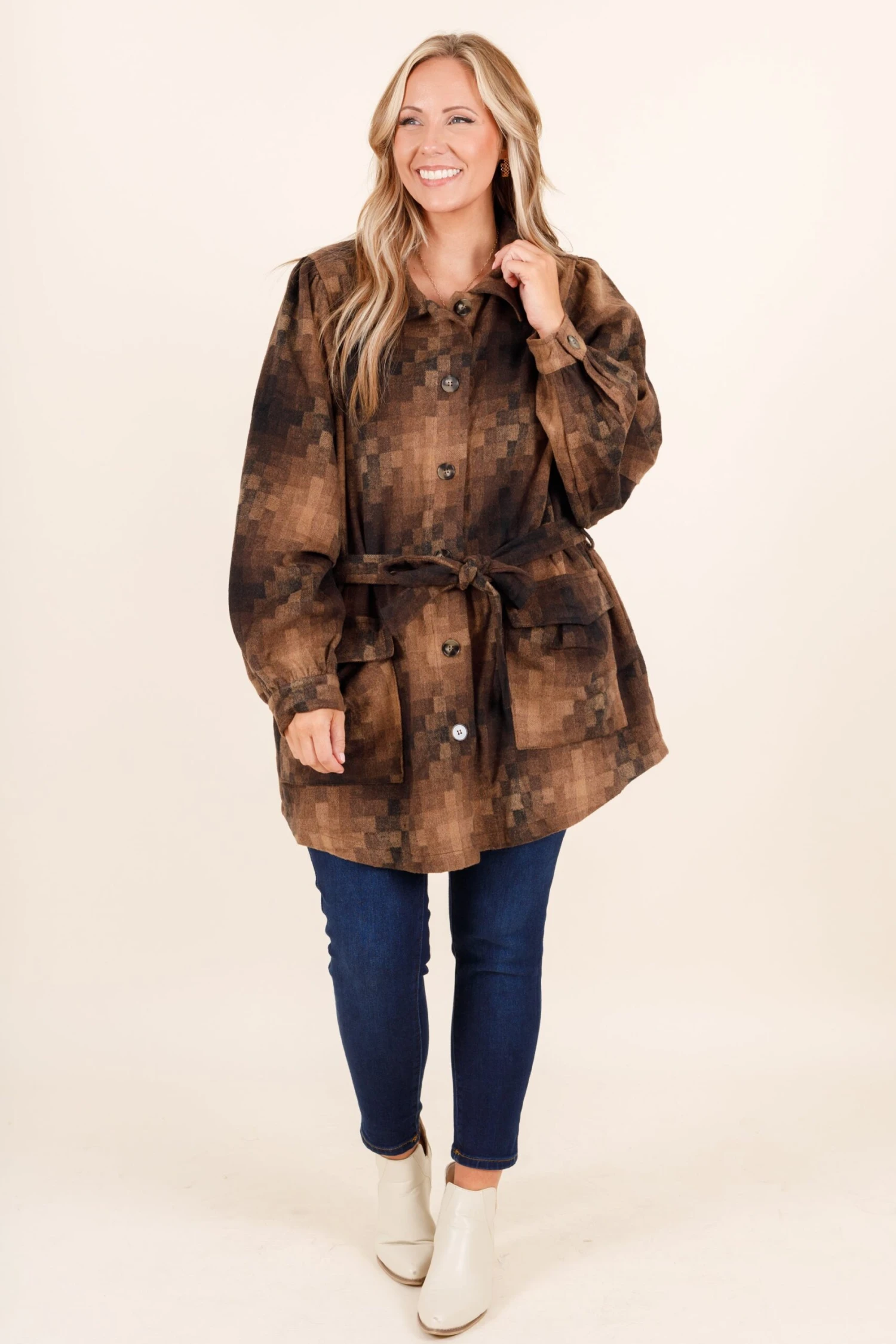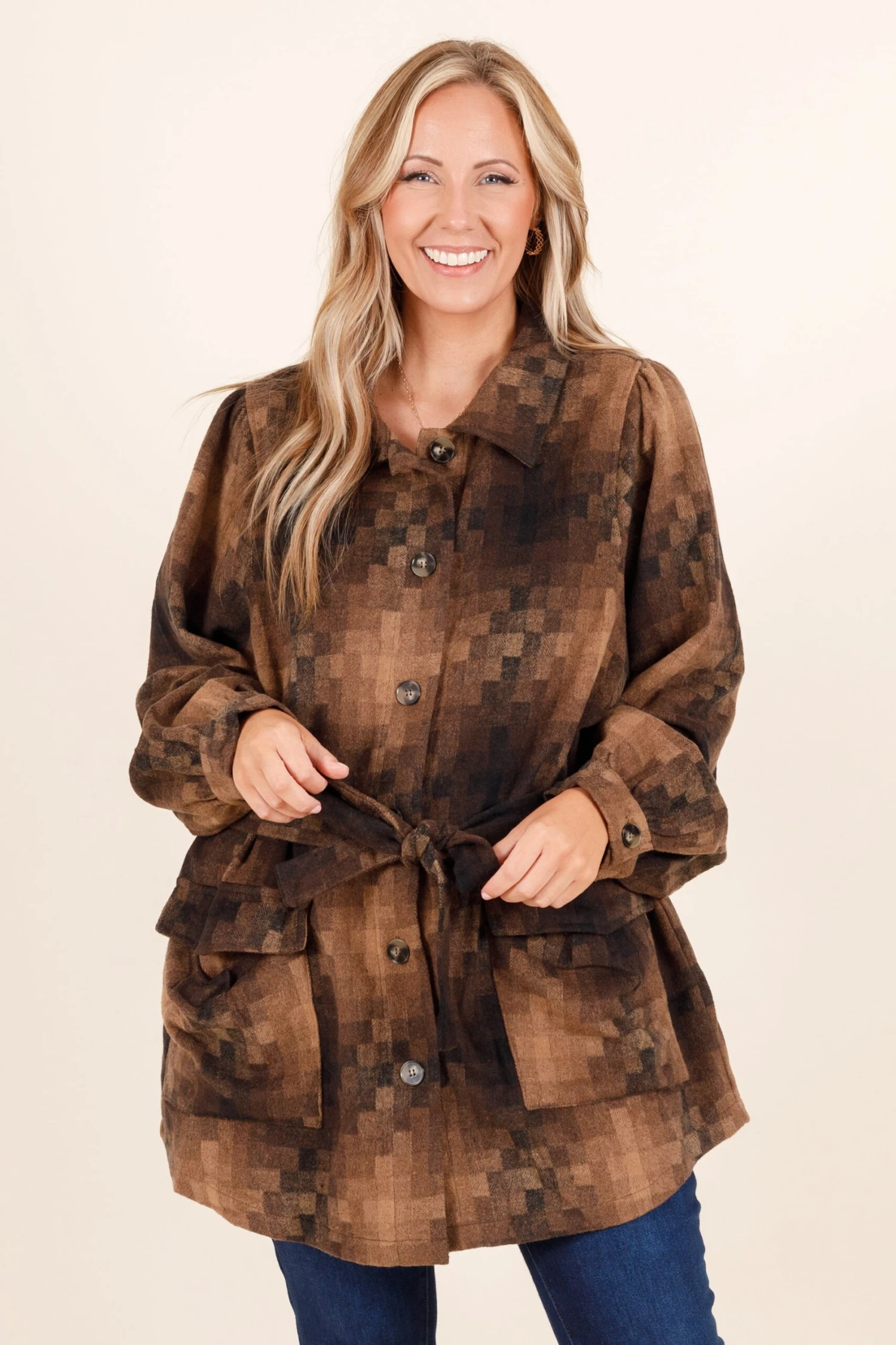 You’ll be so much happier with this beauty in your wardrobe! It is the perfect top for stylish comfort! Its classic style is accented by the neutral brown color, functional front pockets, and waist tie for an adjustable fit. Get cozy with the button-up design for a stylish look that keeps you comfortable!