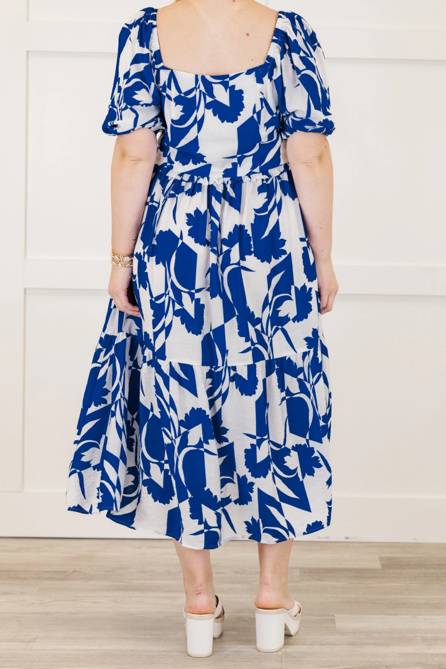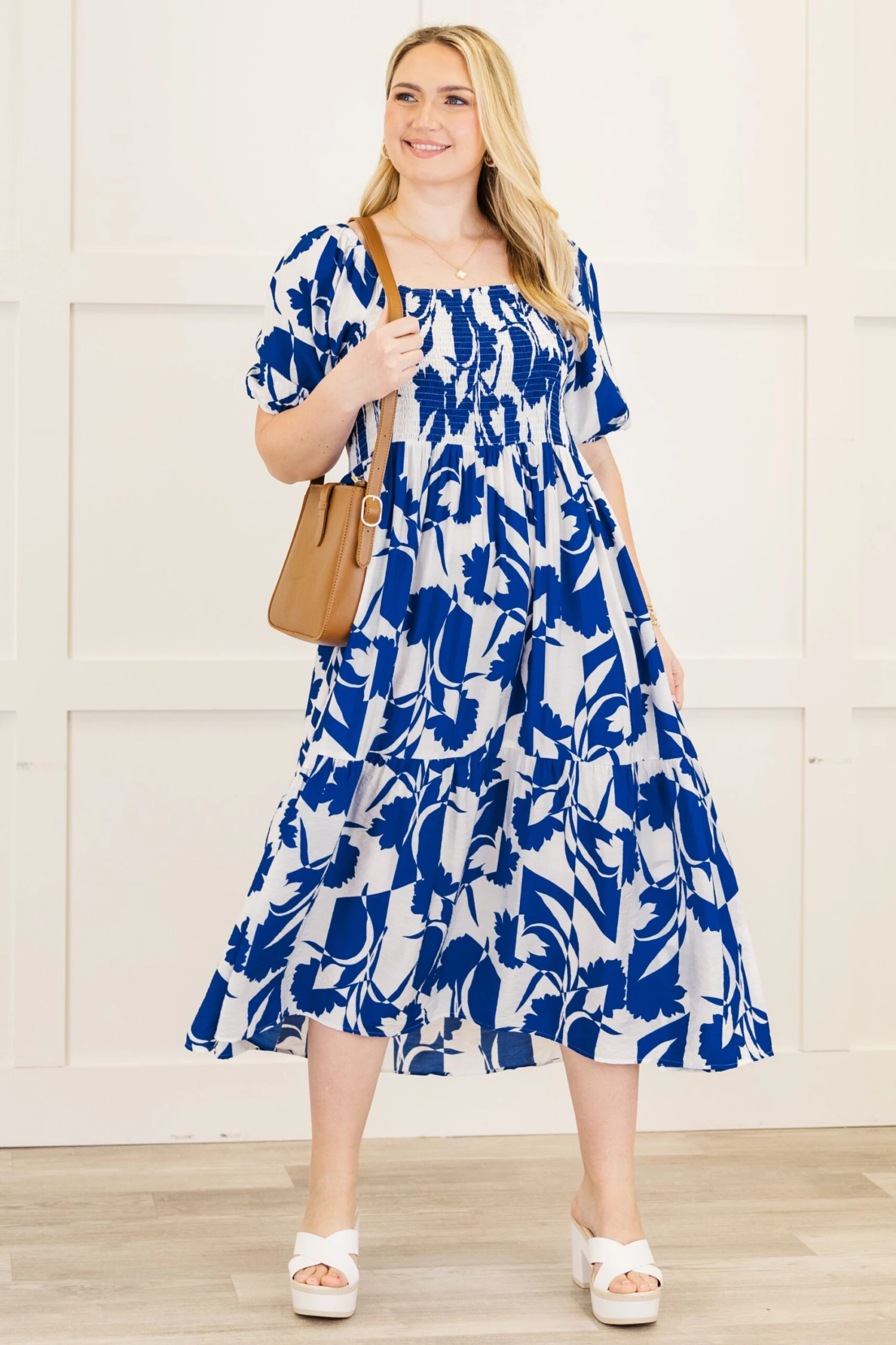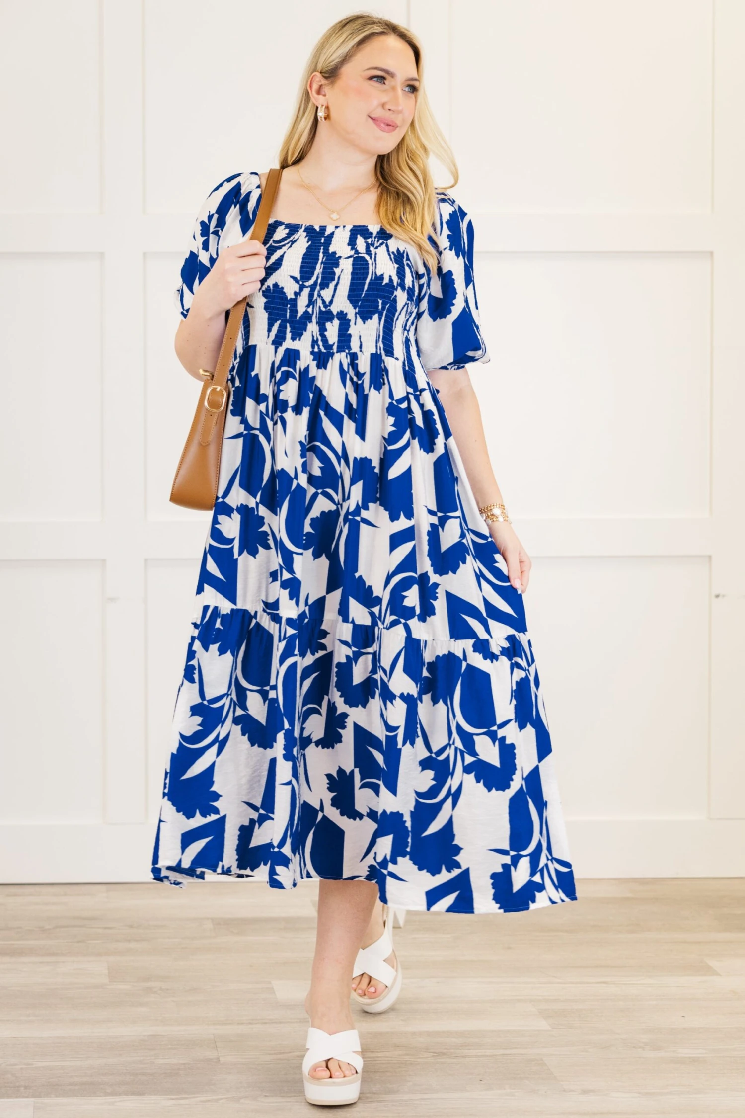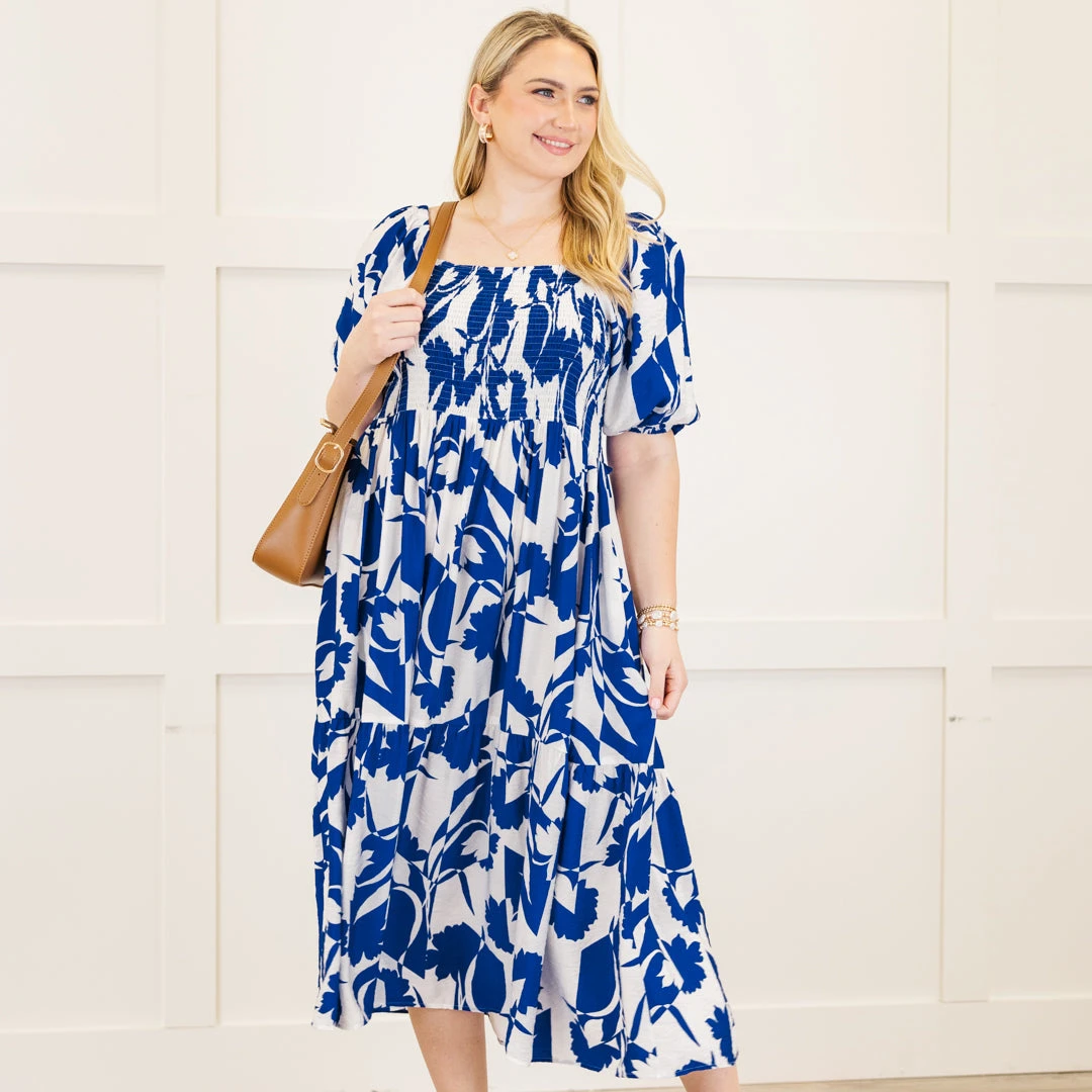 Experience effortless elegance in this dress, crafted in a stunning royal blue and white floral print! With functional pockets for added convenience, a smocked back for a flattering fit, and delicate elastic puff sleeves, this dress is both stylish and practical! Complete the look with a square neckline for a touch of sophistication!
