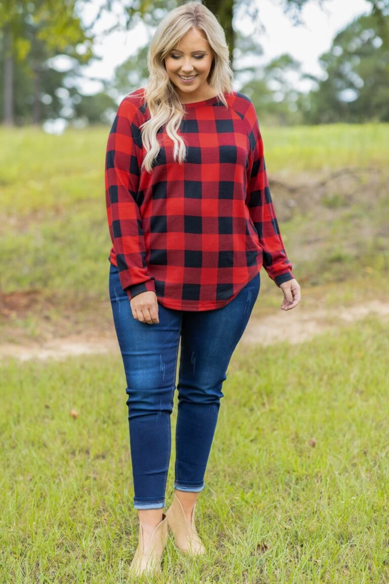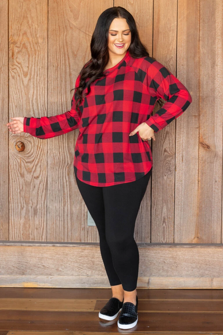 Curved Hem Slouchy Dolman Tunic, Red Plaid
