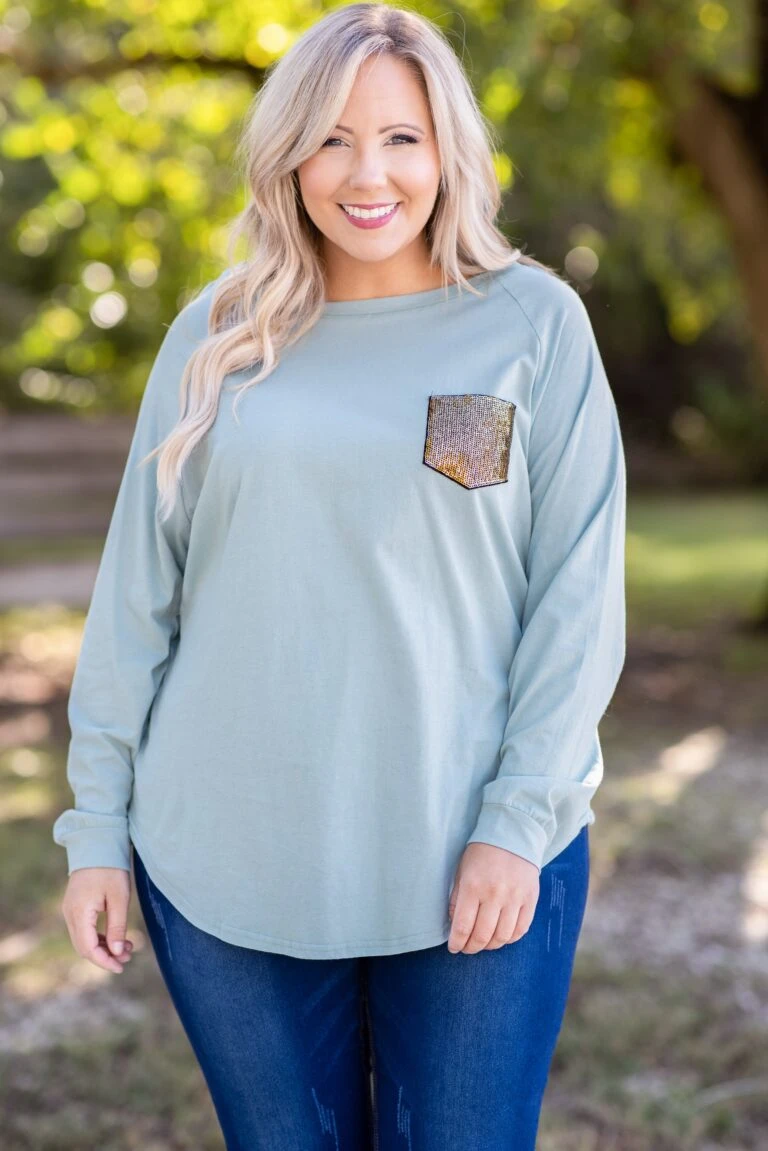 Curved Hem Slouchy Dolman Tunic, Mineral Mint Sequin
