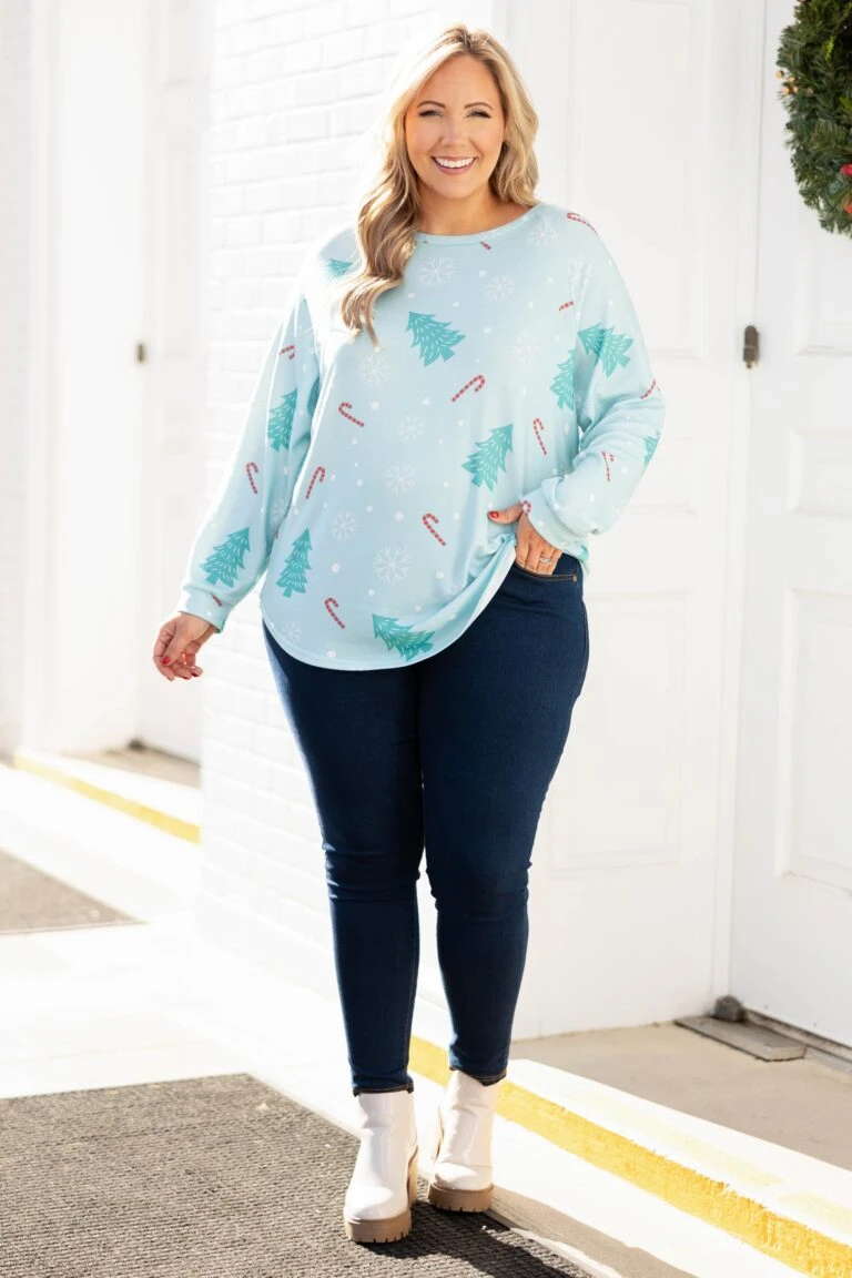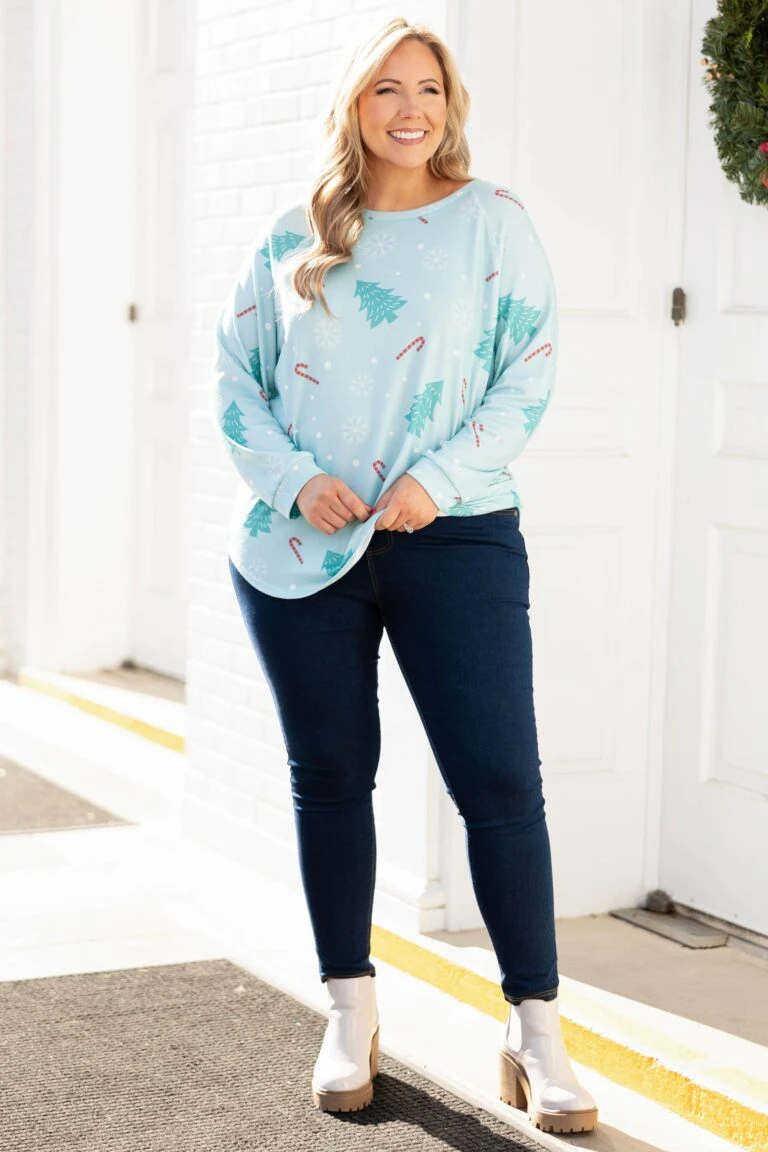 Curved Hem Slouchy Dolman Tunic, Mint Tree Festive