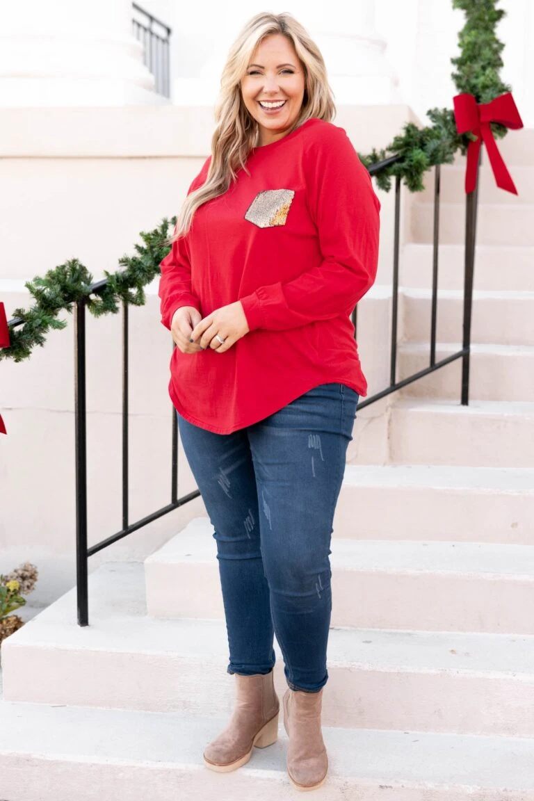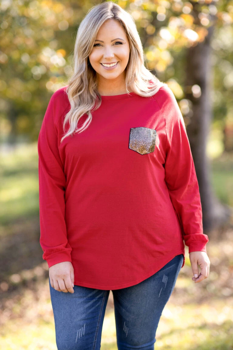 Curved Hem Slouchy Dolman Tunic, Red Sequin