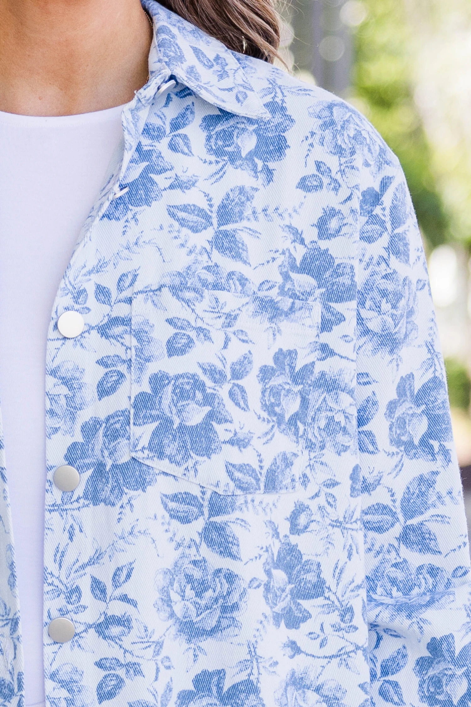 Add a pop of playful charm to your wardrobe with our Rising Rose Jacket in denim! The frayed hemline adds a touch of edge, while the denim floral print is both bold and feminine! Perfectly pairs with a solid cami or blouse for a versatile look!